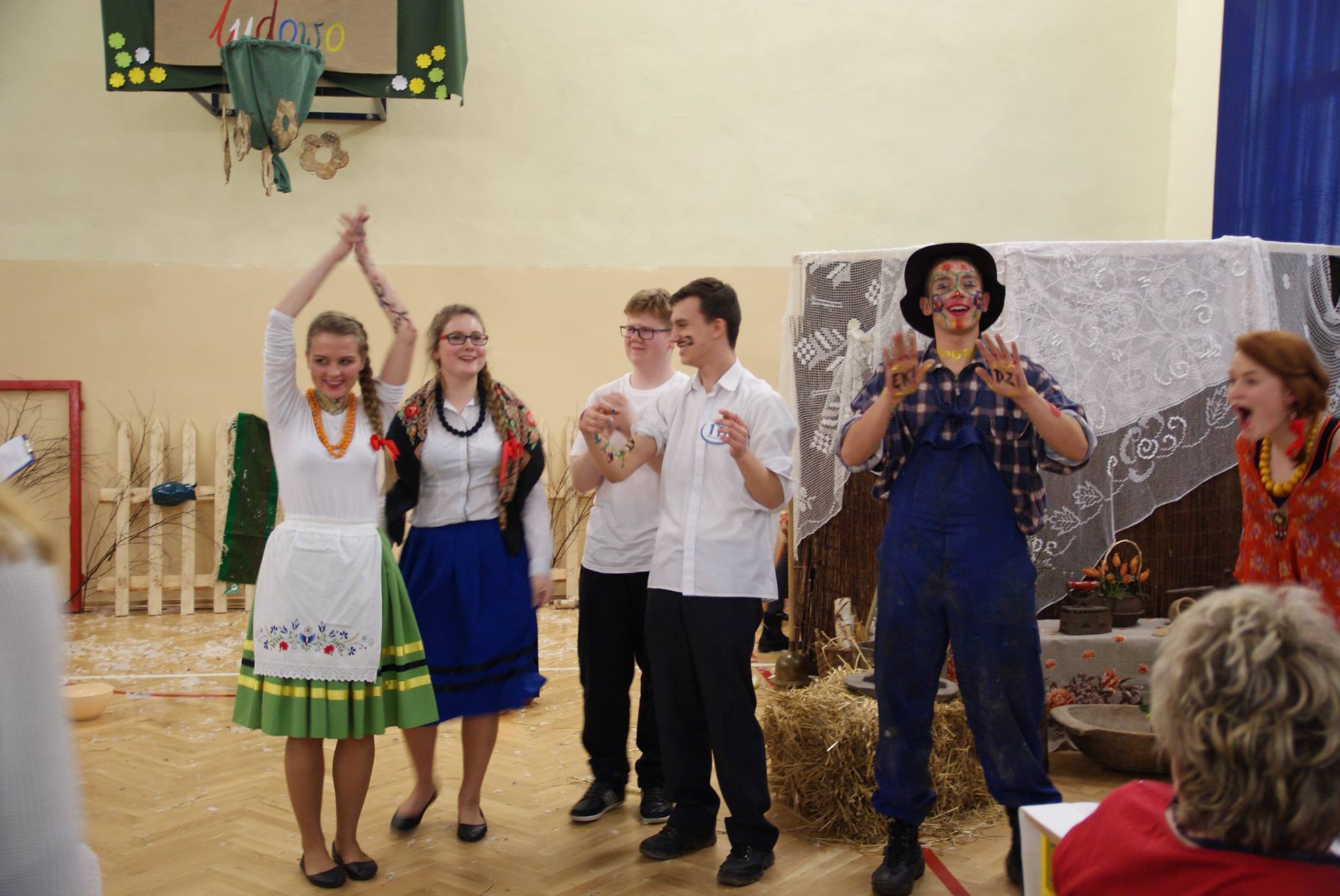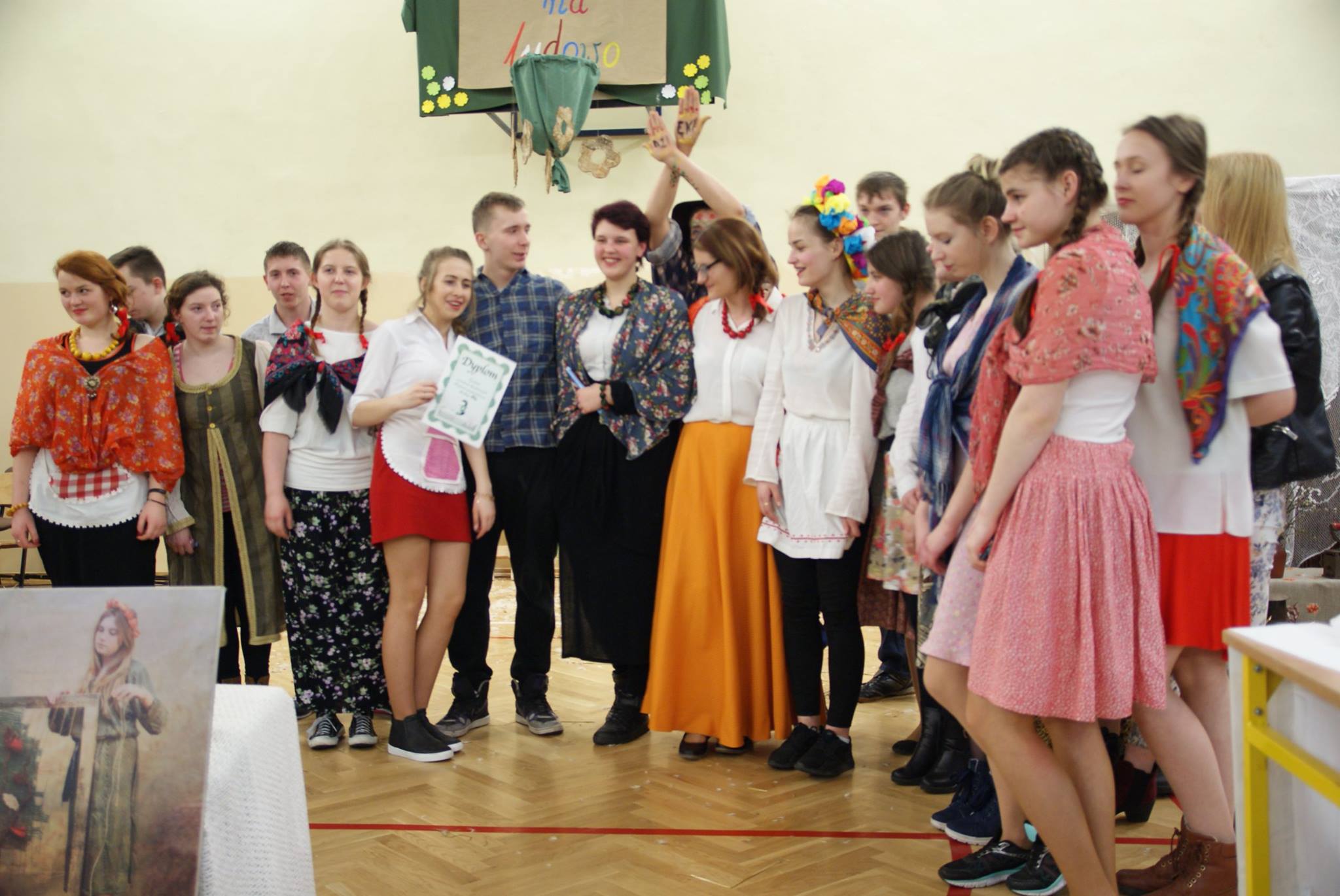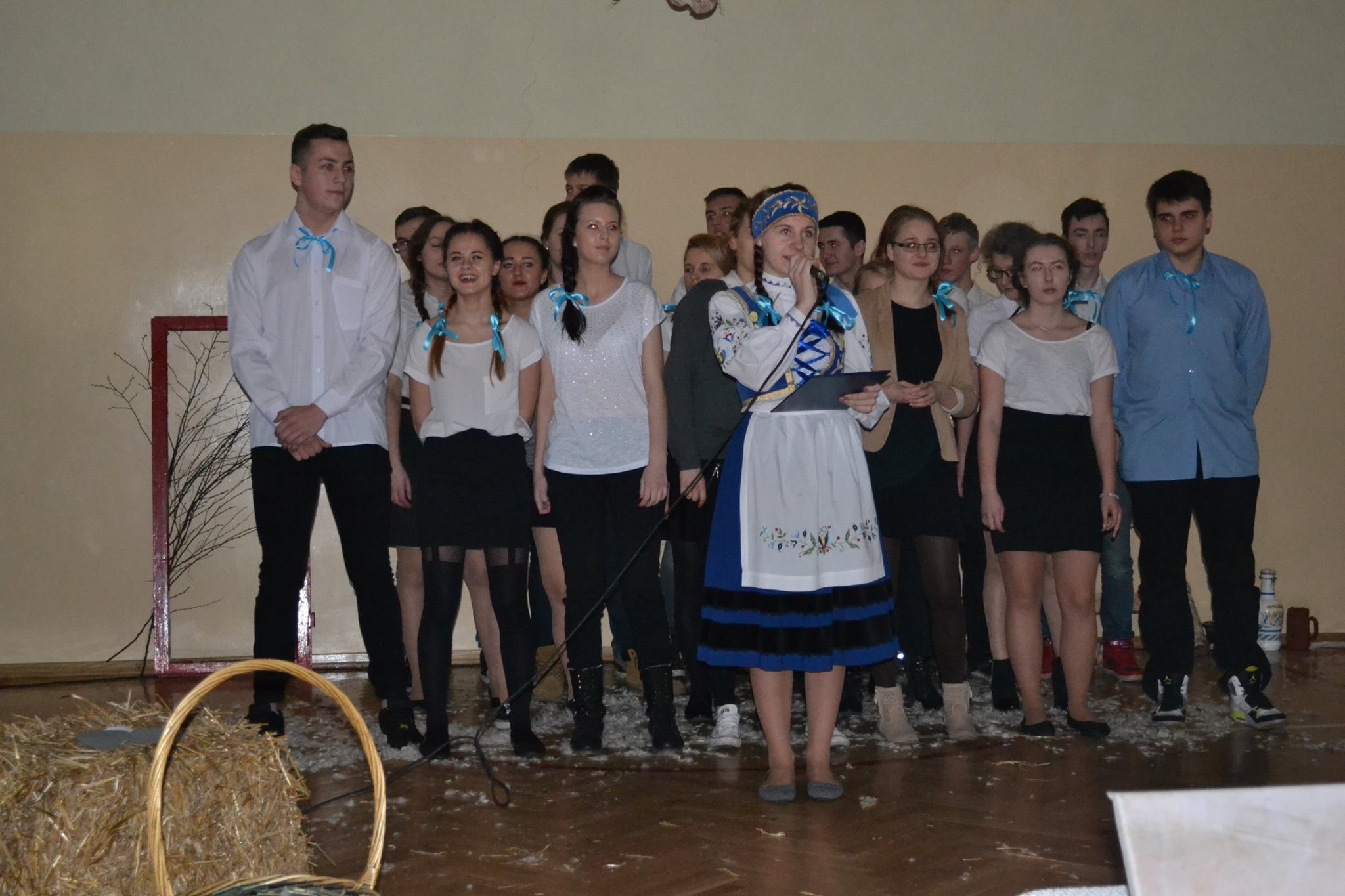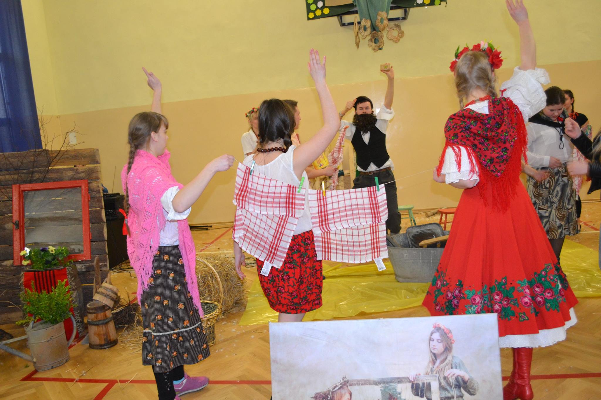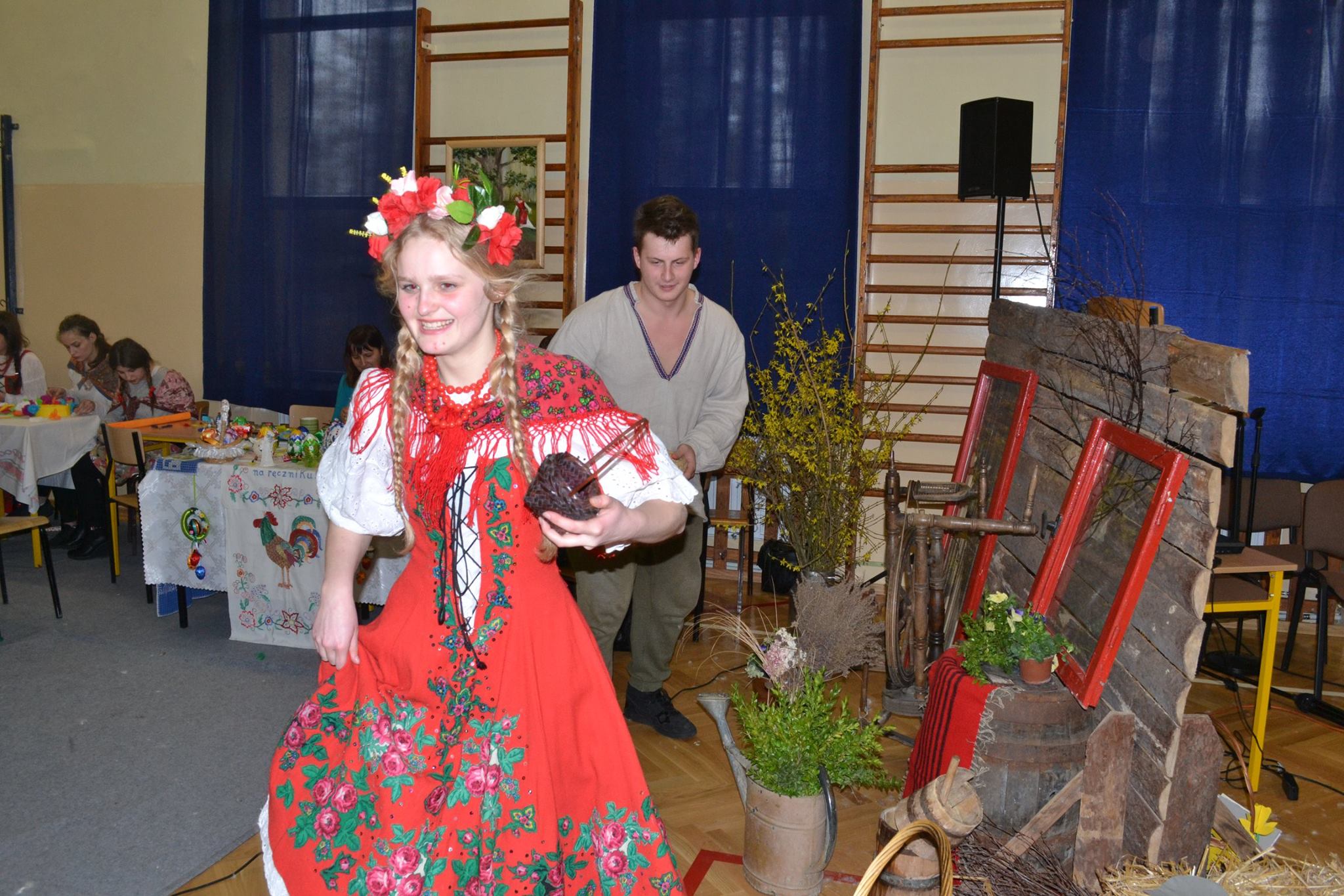 Inscenizacja wystawiona przez koło teatralne "Świta Królowej" oparta była na Reymontowskich "Chłopach". Grupa przebrana w piękne, ludowe stroje, brawurowo wykonała piosenki oraz zilustrowała słowno-muzycznymi scenkami prezentacje klas pierwszych na zadane tematy. Pomysłowa forma, humor oraz temat omawianych przez pierwszaków zagadnień przykuły uwagę widowni, która nagradzała referujących gromkimi brawami. Ciekawy był pomysł na owe prezentacje - wynikał ze specjalizacji poszczególnych klas. I tak, np. informatycy - opowiadali o przepływie informacji dawniej i dziś; architekci krajobrazu i analitycy - o ziołach w ogrodzie Hanki, szeptuchach, wiedźmach, znachorkach. Geodeci omówili rolę ziemi w życiu chłopskiej gromady, technicy energii odnawialnej - przybliżyli pracę młynarza i rolę młyna we wsi, żywieniowcy zaś mówili o jedzeniu - powszednim, przaśnym i specjałach wielkanocnych. Swój wkład w imprezę miało również Centrum Edukacji Regionalnej. Artysta ludowy pan Zenon Frąckiewicz, zaprezentował wystawę rzeźb. Uczniowie mogli zobaczyć, jak powstaje dzieło sztuki. Mieli możliwość chwycić za dłuto i spróbować swoich sił w tym zakresie. Kilku z nich zapisało się na zajęcia do pracowni rzeźbiarskiej prowadzonej przez Centrum Edukacji Regionalnej. Imprezę uświetniła pani Aldona Peplińska wraz z koleżankami. Pod ich bacznym okiem uczniowie stworzyli piękne pisanki, które dekorować będą świąteczne stoły. Pani Aldona zaprezentowała również swoje wiersze z najnowszego tomiku "Na słomkowym dywanie".