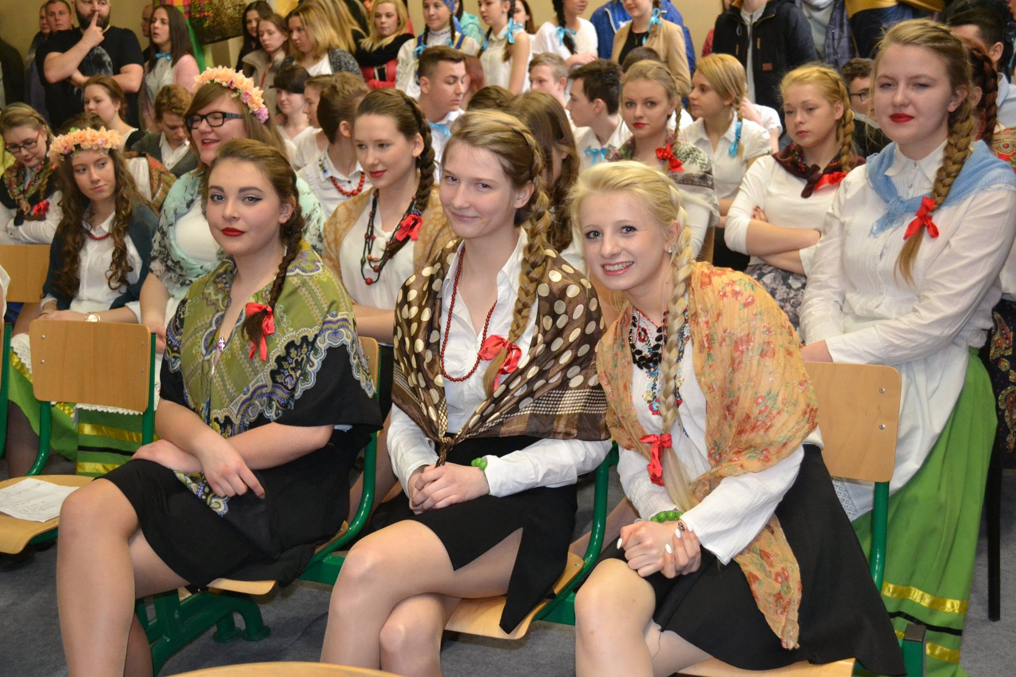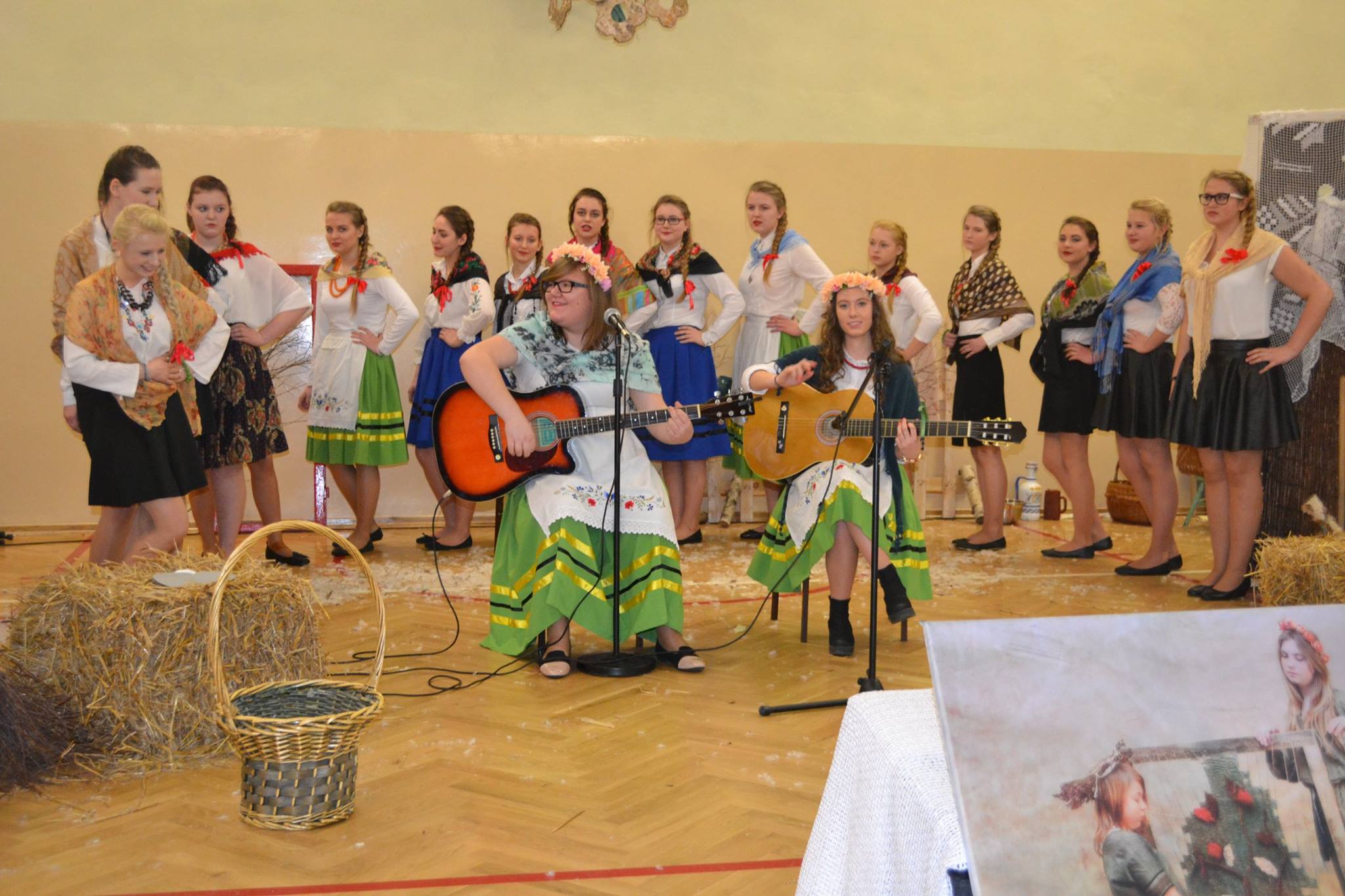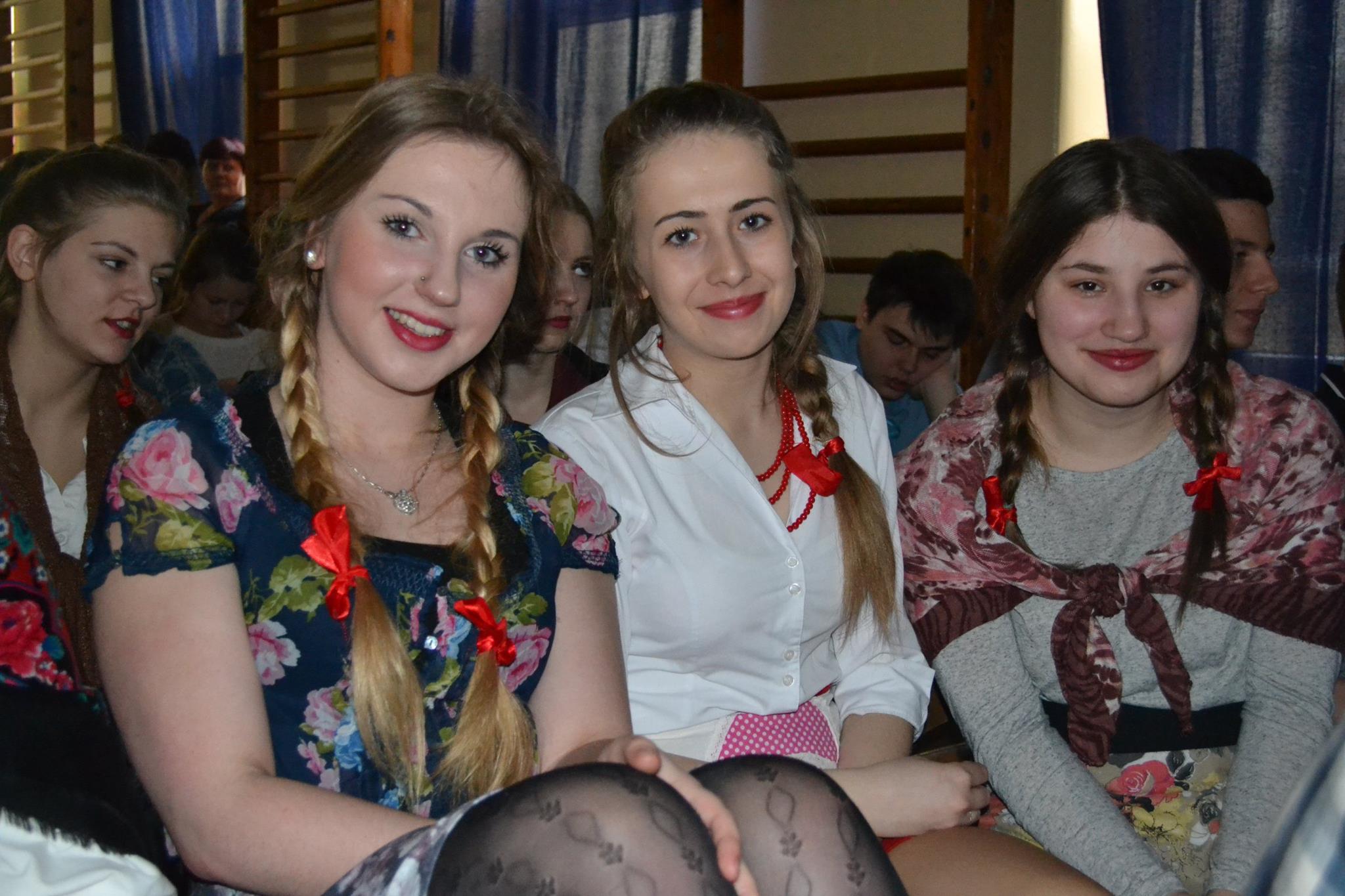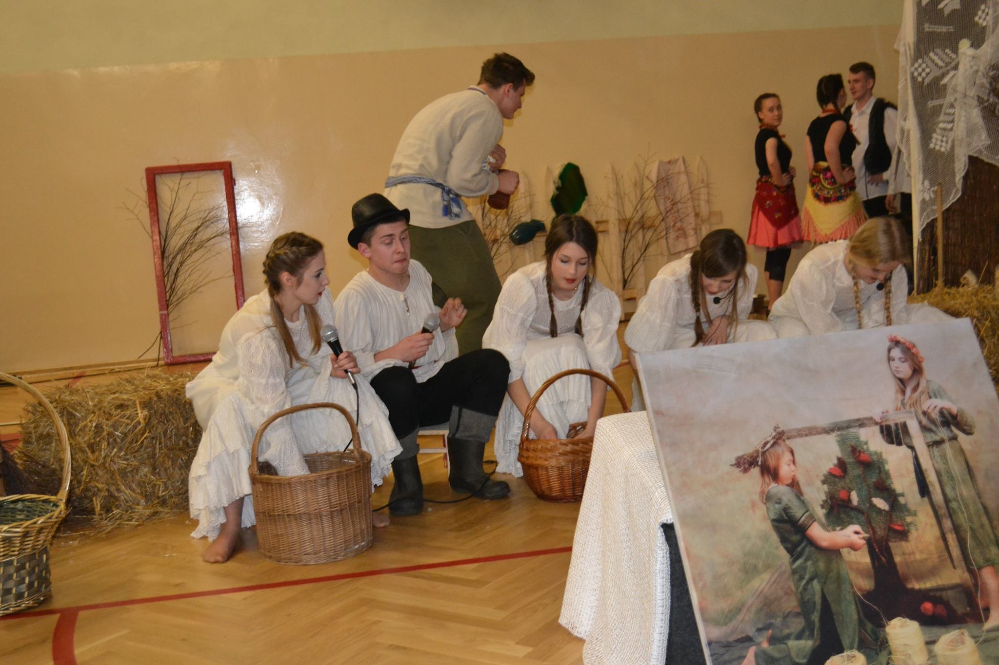 Inscenizacja wystawiona przez koło teatralne "Świta Królowej" oparta była na Reymontowskich "Chłopach". Grupa przebrana w piękne, ludowe stroje, brawurowo wykonała piosenki oraz zilustrowała słowno-muzycznymi scenkami prezentacje klas pierwszych na zadane tematy. Pomysłowa forma, humor oraz temat omawianych przez pierwszaków zagadnień przykuły uwagę widowni, która nagradzała referujących gromkimi brawami. Ciekawy był pomysł na owe prezentacje - wynikał ze specjalizacji poszczególnych klas. I tak, np. informatycy - opowiadali o przepływie informacji dawniej i dziś; architekci krajobrazu i analitycy - o ziołach w ogrodzie Hanki, szeptuchach, wiedźmach, znachorkach. Geodeci omówili rolę ziemi w życiu chłopskiej gromady, technicy energii odnawialnej - przybliżyli pracę młynarza i rolę młyna we wsi, żywieniowcy zaś mówili o jedzeniu - powszednim, przaśnym i specjałach wielkanocnych. Swój wkład w imprezę miało również Centrum Edukacji Regionalnej. Artysta ludowy pan Zenon Frąckiewicz, zaprezentował wystawę rzeźb. Uczniowie mogli zobaczyć, jak powstaje dzieło sztuki. Mieli możliwość chwycić za dłuto i spróbować swoich sił w tym zakresie. Kilku z nich zapisało się na zajęcia do pracowni rzeźbiarskiej prowadzonej przez Centrum Edukacji Regionalnej. Imprezę uświetniła pani Aldona Peplińska wraz z koleżankami. Pod ich bacznym okiem uczniowie stworzyli piękne pisanki, które dekorować będą świąteczne stoły. Pani Aldona zaprezentowała również swoje wiersze z najnowszego tomiku "Na słomkowym dywanie".