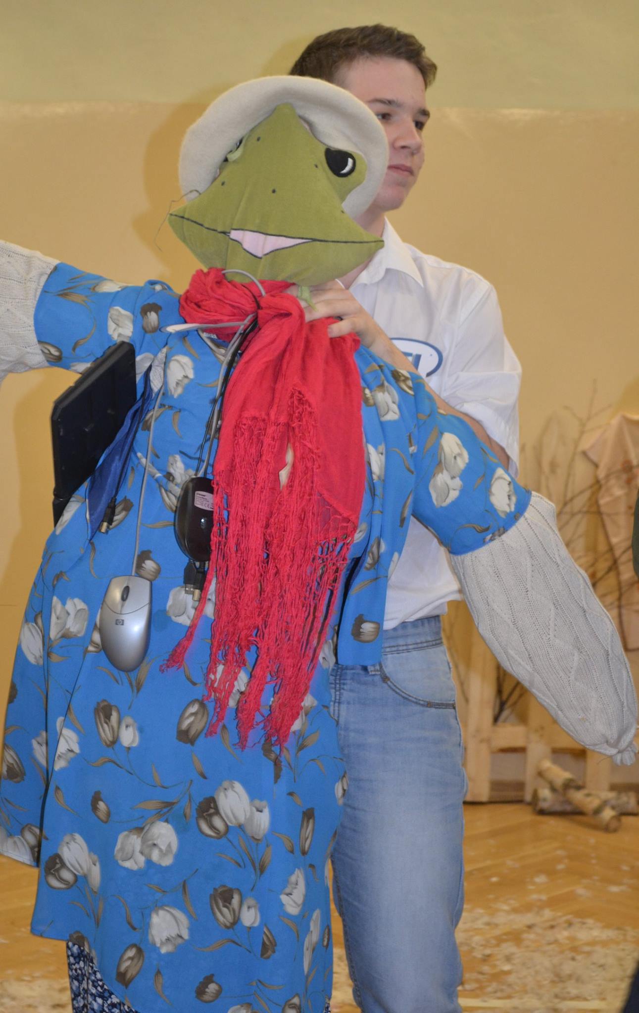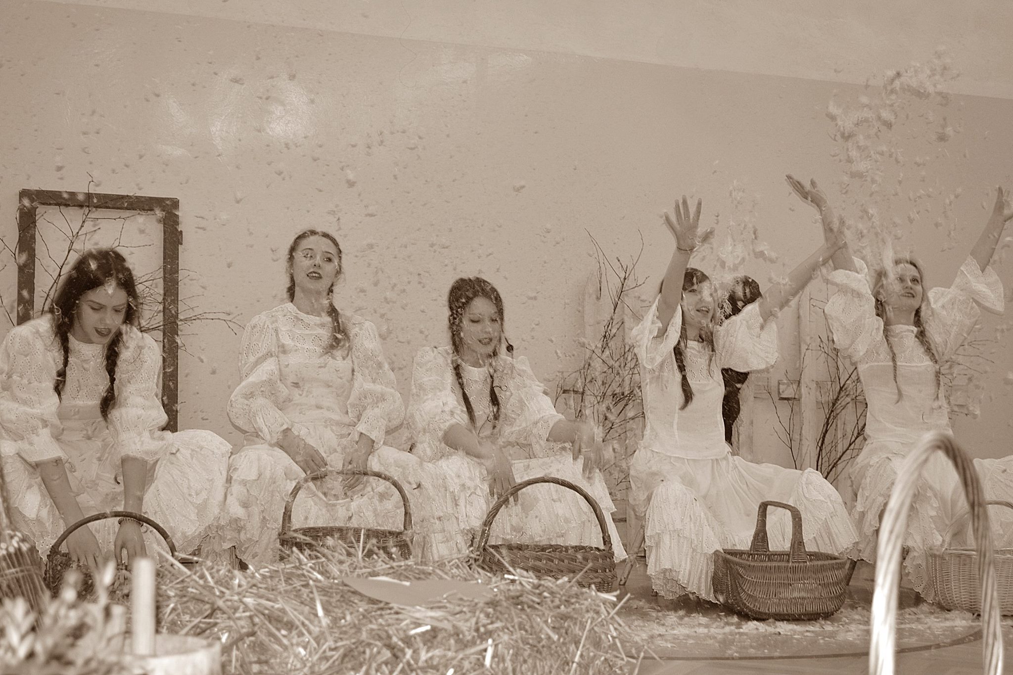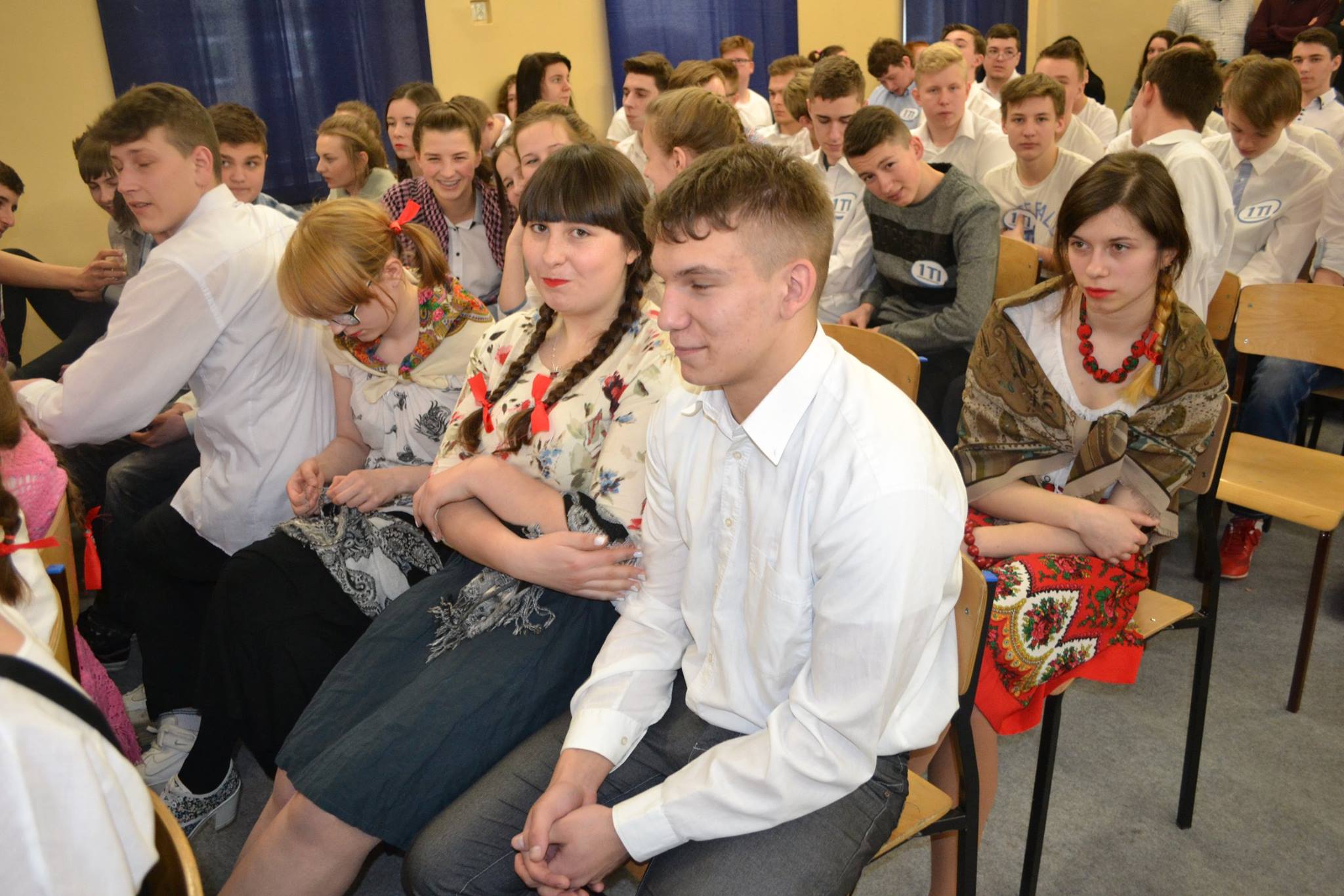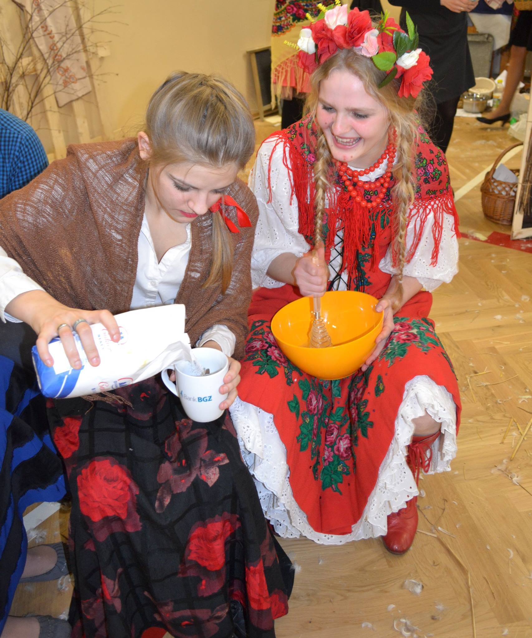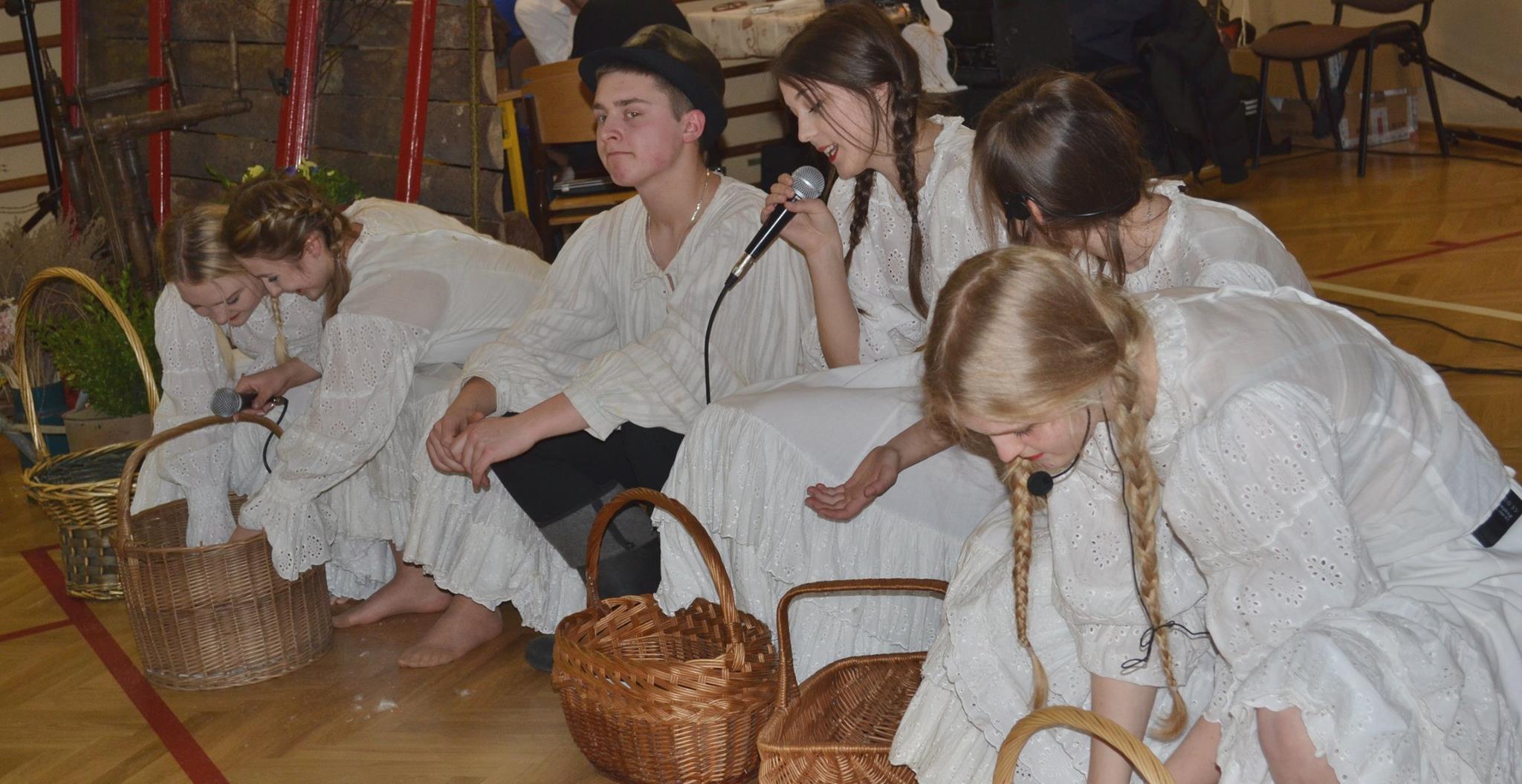 Inscenizacja wystawiona przez koło teatralne "Świta Królowej" oparta była na Reymontowskich "Chłopach". Grupa przebrana w piękne, ludowe stroje, brawurowo wykonała piosenki oraz zilustrowała słowno-muzycznymi scenkami prezentacje klas pierwszych na zadane tematy. Pomysłowa forma, humor oraz temat omawianych przez pierwszaków zagadnień przykuły uwagę widowni, która nagradzała referujących gromkimi brawami. Ciekawy był pomysł na owe prezentacje - wynikał ze specjalizacji poszczególnych klas. I tak, np. informatycy - opowiadali o przepływie informacji dawniej i dziś; architekci krajobrazu i analitycy - o ziołach w ogrodzie Hanki, szeptuchach, wiedźmach, znachorkach. Geodeci omówili rolę ziemi w życiu chłopskiej gromady, technicy energii odnawialnej - przybliżyli pracę młynarza i rolę młyna we wsi, żywieniowcy zaś mówili o jedzeniu - powszednim, przaśnym i specjałach wielkanocnych. Swój wkład w imprezę miało również Centrum Edukacji Regionalnej. Artysta ludowy pan Zenon Frąckiewicz, zaprezentował wystawę rzeźb. Uczniowie mogli zobaczyć, jak powstaje dzieło sztuki. Mieli możliwość chwycić za dłuto i spróbować swoich sił w tym zakresie. Kilku z nich zapisało się na zajęcia do pracowni rzeźbiarskiej prowadzonej przez Centrum Edukacji Regionalnej. Imprezę uświetniła pani Aldona Peplińska wraz z koleżankami. Pod ich bacznym okiem uczniowie stworzyli piękne pisanki, które dekorować będą świąteczne stoły. Pani Aldona zaprezentowała również swoje wiersze z najnowszego tomiku "Na słomkowym dywanie".