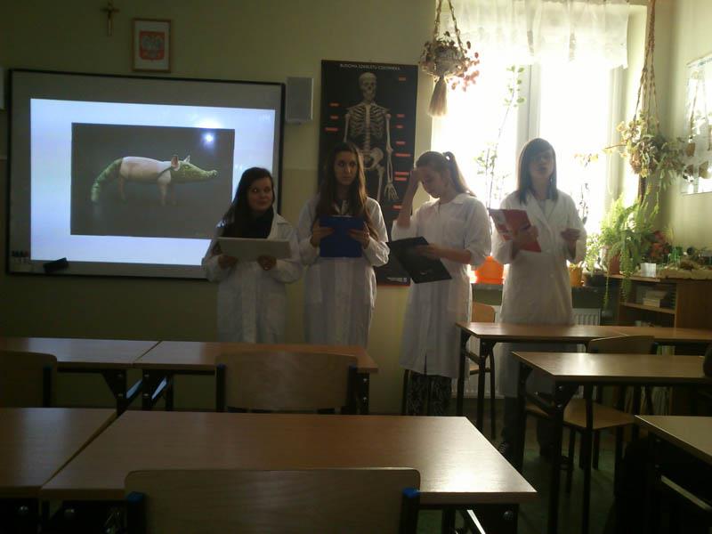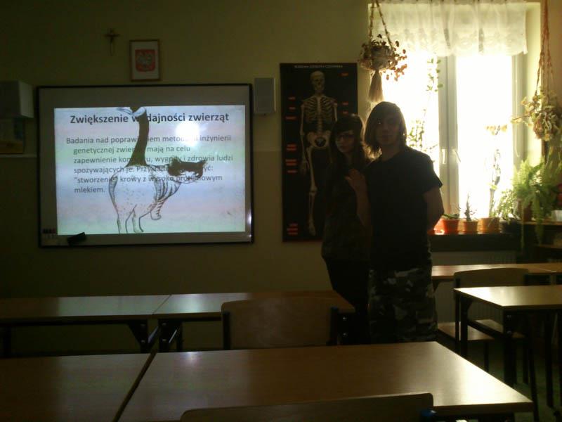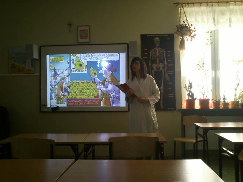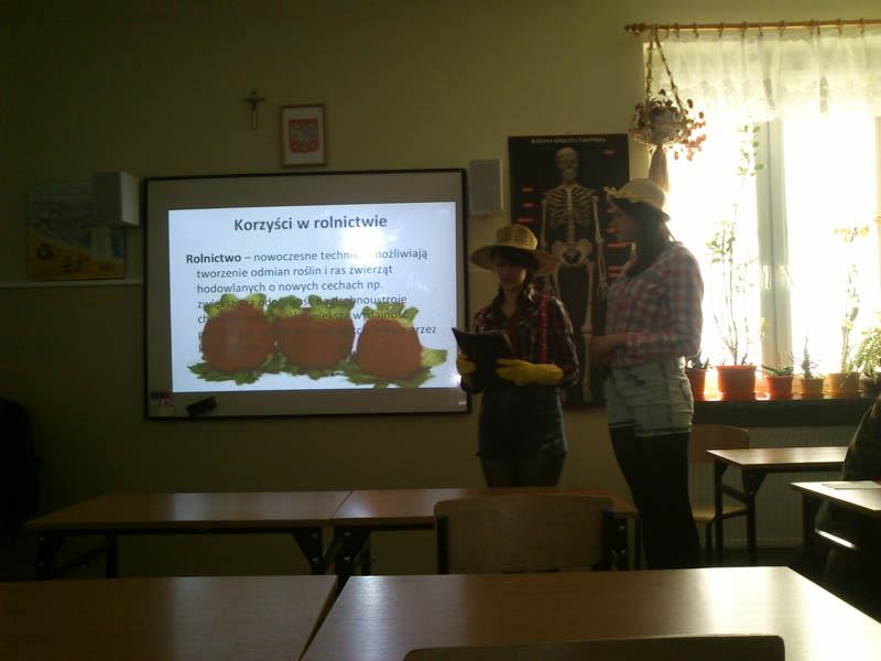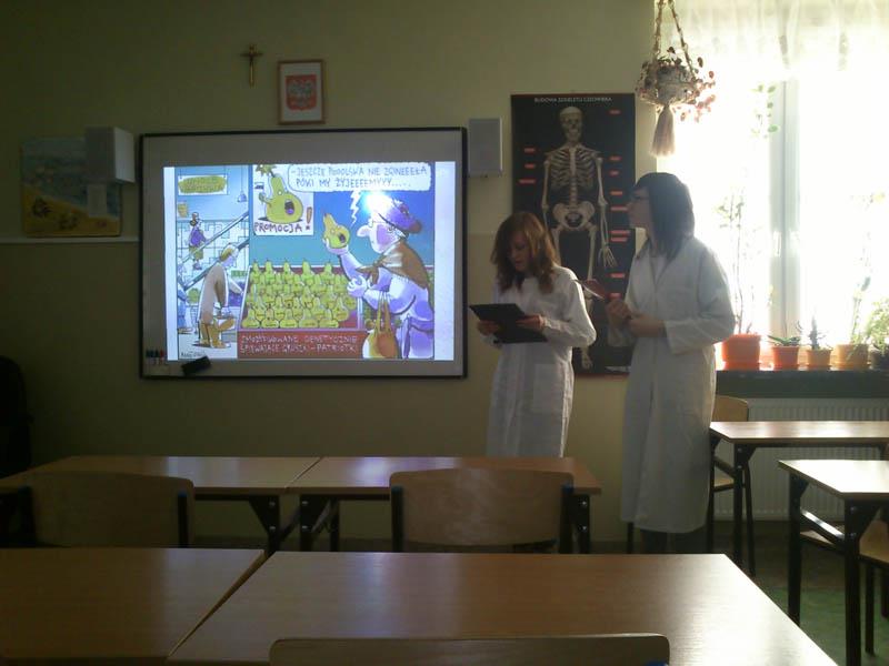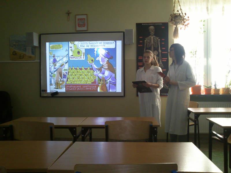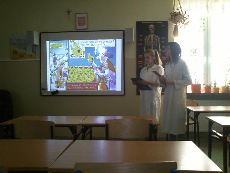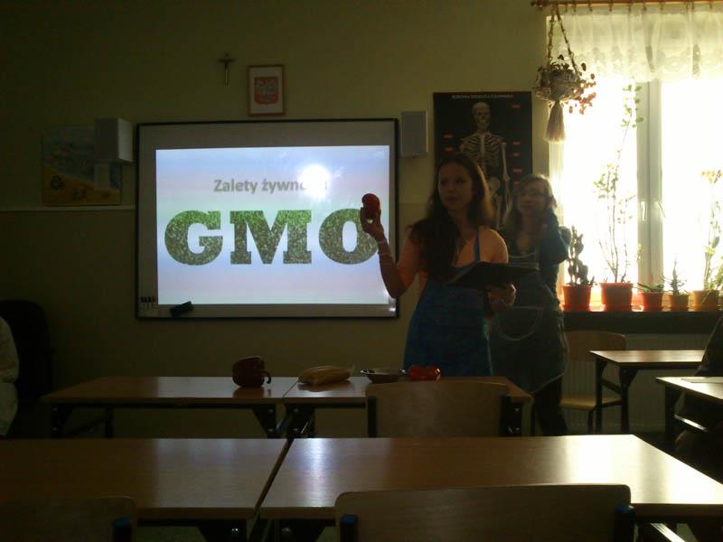 W kwietniu odbyła się seria przedstawień na temat GMO (Genetically Modified Organisms) czyli organizmów genetycznie modyfikowanych. Zdarzenie miało miejsce w klasie biologicznej Pani mgr Marii Perz, która była również pomysłodawczynią całego przedsięwzięcia. Udział brały wszystkie klasy pierwsze. Przedstawienia były bardzo interesujące, każda grupa ubrana była
