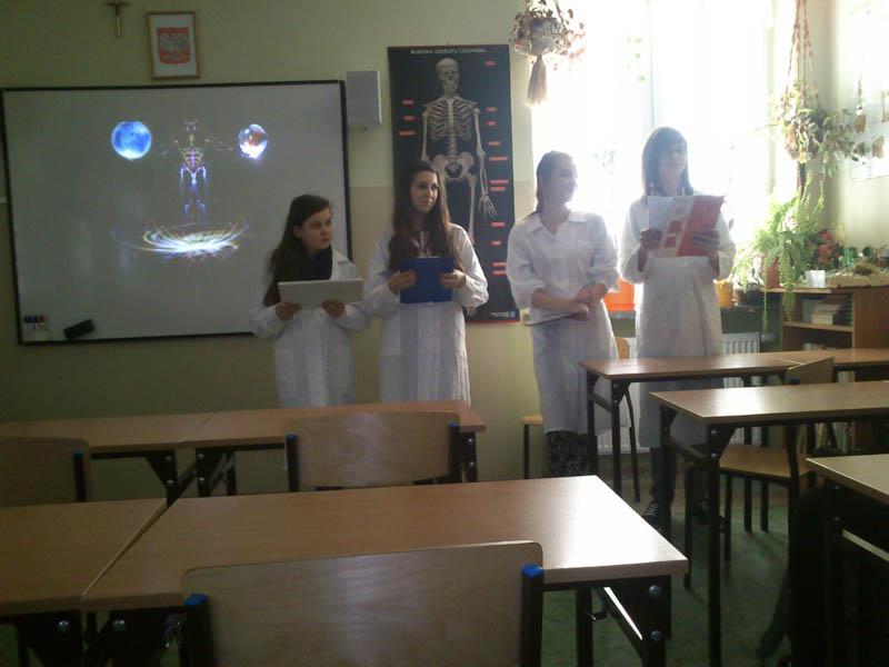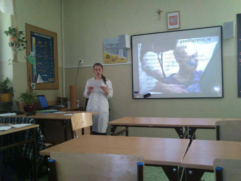 w odpowiednie stroje i posiadała ciekawe rekwizyty. Uczestnicy podawali w żartobliwy i przystępny sposób dużo ciekawych informacji na temat GMO,przedstawili wady i zalety wykorzystywania organizmów modyfikowanych genetycznie, wykonywali różne doświadczenia, takie jak: pobieranie odcisków palców, testy DNA. Całość dowiodła, że można się świetnie bawić, a jednocześnie wiele nauczyć.A co za tym idzie? Biologia wcale nie jest straszna!
