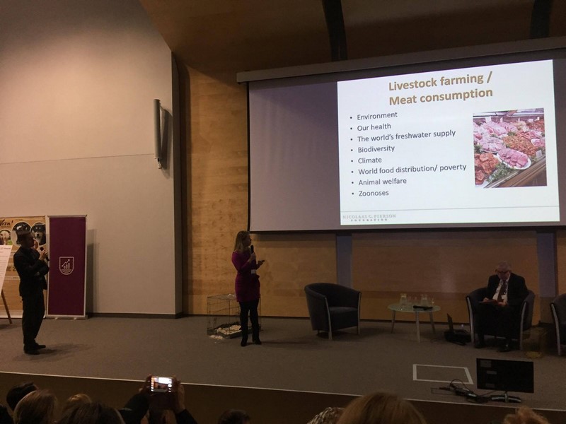 Następnie można było usłyszeć wypowiedź przedstawicielki Fundacji Nicolaasa G. Pierson’a z Holandii. Poruszyła ona dość ważny temat, a mianowicie pokazała wszystkim ludziom biorącym udział w konferencji, że spożywanie mięsa przez ludzi niesie za sobą wiele nieprzyjemnych dla środowiska skutków .