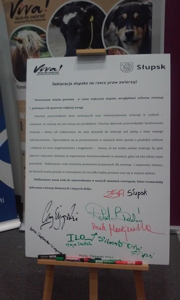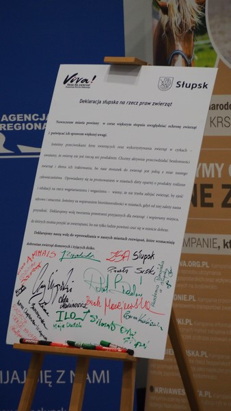 Na samym początku Prezydent Słupska Robert Biedroń i Prezes Fundacji Międzynarodowy Ruch Na Rzecz Zwierząt Viva! Cezary Wyszyński podpisali Deklarację na rzecz praw zwierząt - zgodnie z jej treścią wprowadzone zostaną rozwiązania, które mają na celu poprawę dobrostanu zwierząt zarówno domowych, jak i wolno żyjących.