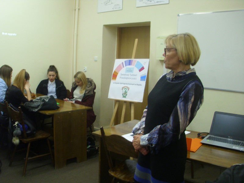 W dniu 16 listopada w ramach Światowego Tygodnia Przedsiębiorczości zajęcia w formie warsztatów prowadziła p. Ewa Olszówka, specjalista ds. rozwoju zawodowego , doradca zawodowy z Centrum Edukacji i Pracy Młodzieży OHP w Słupsku. Uczestnikami szkolenia byli uczniowie klasy IV TEŻ. Celem zajęć było zapoznanie uczniów z tendencjami współczesnego rynku pracy i wymaganiami potencjalnych pracodawców oraz kształtowanie postaw ukierunkowanych na otwartość na zmiany i pojawiające się szanse.