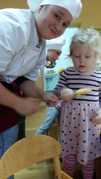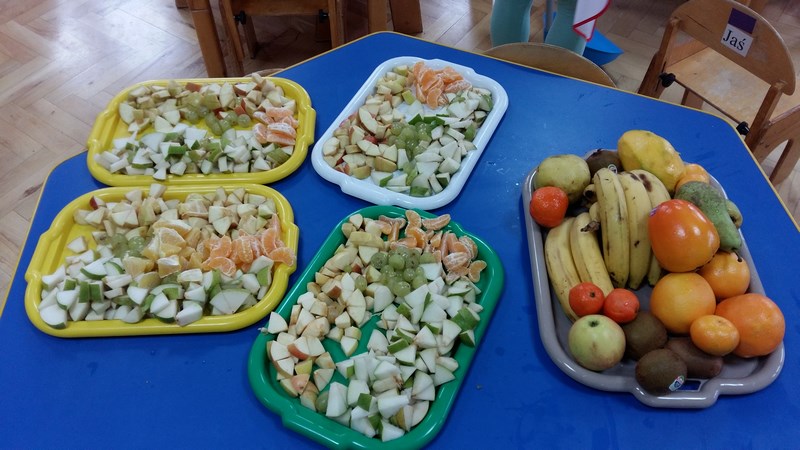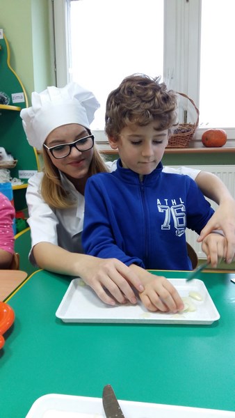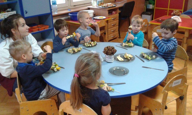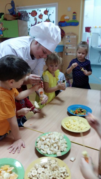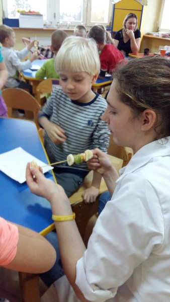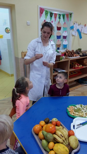 Dziewczęta wspólnie z dziećmi przygotowały pyszne owocowe szaszłyki. W trakcie spotkania przedszkolaki dowiedziały się, że jesień to czas, kiedy jest dużo różnorodnych owoców, że wszystkie są smaczne i zdrowe oraz, że można je spożywać w różnej postaci. Mogły również porównać wygląd i smak wybranych owoców. Po wspólnej pracy odbyła się degustacja. Owocowe szaszłyki wszystkim bardzo smakowały. Organizatorem akcji był Szkolny Klub Wolontariusza.