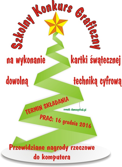 Zapraszamy do udziału w szkolnym konkursie graficznym na najładniejszą kartkę bożonarodzeniową wykonaną dowolną techniką cyfrową. Prace w formacie jpg lub png przygotowane do druku w formacie A5 należy zgłaszać do nauczycieli M. Damski, J. Wolikowski lub Sz. Burak. Przewidziane nagrody rzeczowe. Zapraszamy!