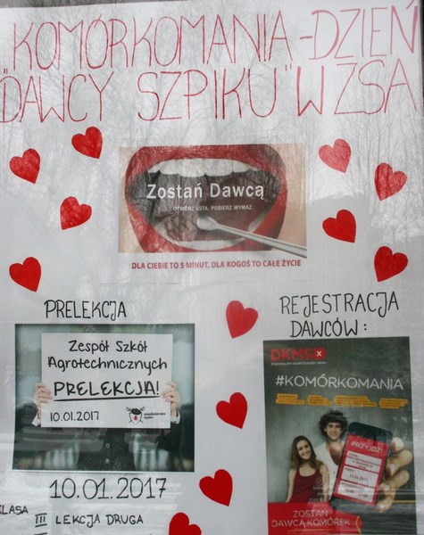 Dnia 10.01.2017r. „Muszkieterowie Szpiku” przeprowadzili akcję edukacyjną dla uczniów naszej szkoły, potencjalnych Dawców Szpiku. Zajęcia odbyły się 10stycznia 2017r. - przeszkolono około 300 uczniów. Dnia 11 stycznia 2017r. przeprowadzono akcję rejestracji potencjalnych Dawców pod hasłem „KOMÓRKOMANIA - ZSA w Słupsku”. Zarejestrowało się do Banku Szpiku 52 uczniów naszej szkoły.