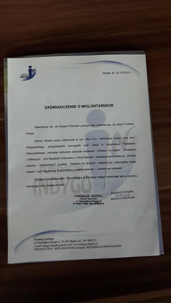 Kacper jest aktywnym wolontariuszem Fundacji Indygo w Słupsku. Podejmuje liczne działania, akcje i inicjatywy na rzecz środowiska lokalnego. W tym roku zakres działań obejmował m.in. wykonanie muralu przy ulicy Wyspiańskiego w Słupsku, przygotowanie scenografii i udział w inscenizacji Powstania Warszawskiego, animacje kulturalne podczas wydarzeń „Witkacy na trawie”, „Śniadania z Witkacym”, „Zlot Słupskich Czarownic z Triną Papisten”, realizacja warsztatów pn.”Ginące zawody-Reaktywacja”, realizacja Projektu „Pędzlem po ekranie”, miejskiej gry „Uporządkuj swoje miasto” oraz happeningu „Stop przemocy wobec zwierząt - Zwierzę też człowiek”.