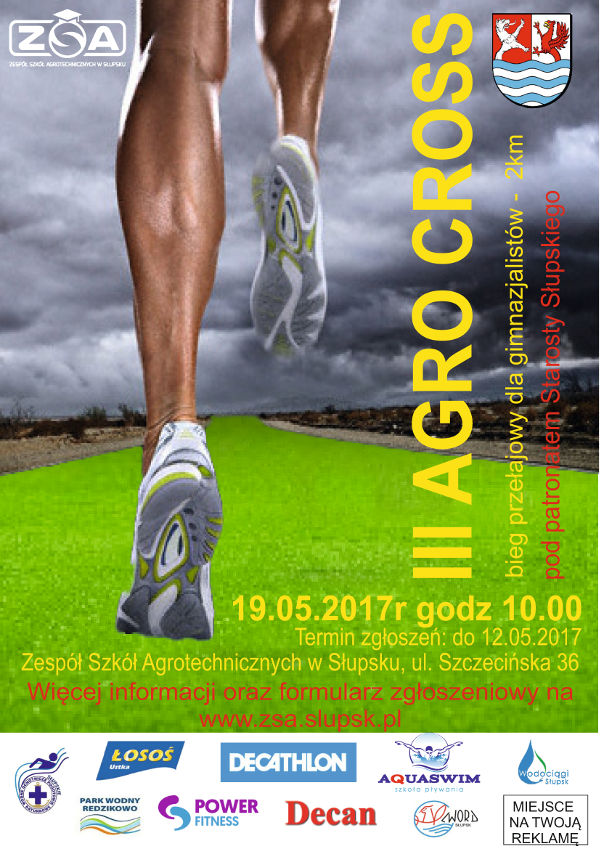 Już po raz trzeci w historii naszej szkoły organizujemy bieg przełajowy AGRO CROSS dla II i III klas gimnazjalnych. Zdecydowaliśmy się na organizację tak dużego przedsięwzięcia, ponieważ jesteśmy przekonani, że bieganie stało się sportem bardzo popularnym a zarazem cieszącym się dużym zainteresowaniem mediów. Patronat nad biegiem objął tradycyjnie Starosta Słupski - Pan Zdzisław Kołodziejski. Do udziału w zawodach zostały zaproszone szkoły gimnazjalne ze Słupska i powiatu słupskiego. Impreza odbywać się będzie na terenach Zespołu Szkół Agrotechnicznych w dniu 19.05.2017r. o godz.10.00. Planujemy udział 300 młodych sportowców.