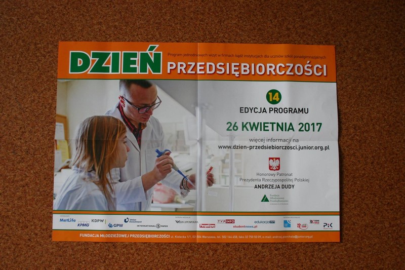 Tegoroczna, czternasta już edycja Dnia Przedsiębiorczości odbyła się w dniu 26 kwietnia 2017r. Corocznie program ten organizowany jest przez Fundację Młodzieżowej Przedsiębiorczości a honorowy patronat sprawuje nad nim Prezydent RP. W tym roku w Dniu Przedsiębiorczości wzięło udział 41 uczniów naszej szkoły. Odbyli oni staż jednodniowy w wybranych przez siebie firmach i instytucjach.