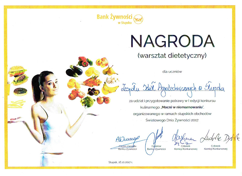 W konkursie kulinarnym „Mocni w niemarnowaniu”. Wiktoria Bąkowska i Krystian Kozłowski z klasy 2 TUŻ otrzymali wyróżnienie za przygotowanie potrawy w I edycji konkursu kulinarnego „Mocni w niemarnowaniu”. Celem konkursu było promowanie idei niemarnowania żywności oraz wyłonienie najciekawszej potrawy, której produktem bazowym był makaron. Organizatorem konkursu był Bank Żywności w Słupsku.