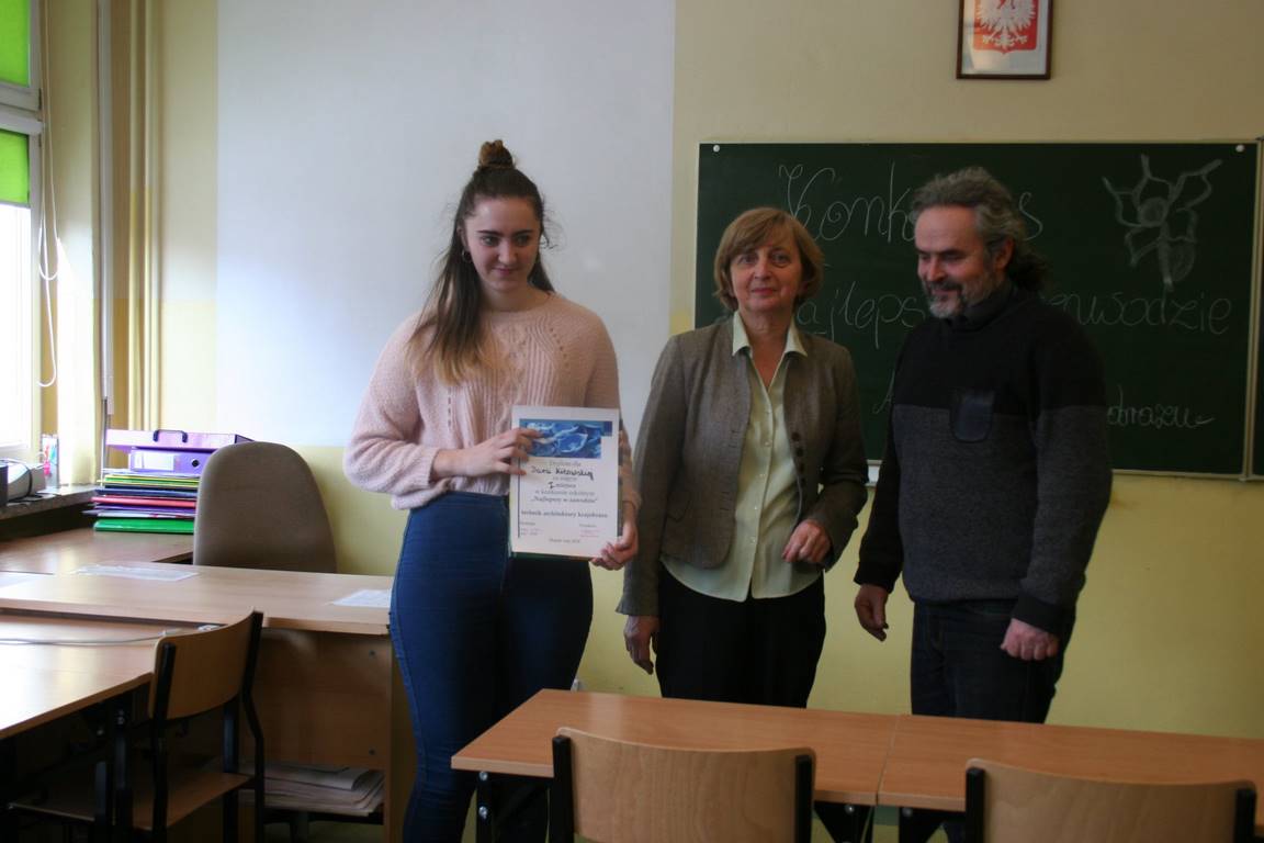W dniu 28.02.2018r. odbyła się w naszej szkole III edycja konkursu "Najlepszy w zawodzie" dla technika architektury krajobrazu. Do konkursu przystąpiło 6 uczniów z klasy III, którzy wykazali się wiedzą teoretyczną rozwiązując test pisemny. W części praktycznej uczniowie rozpoznawali drzewa i krzewy roślin ozdobnych, zaprojektowali obsadzenie kwietnika sezonowego oraz zaproponowali i opisali wybraną metodę stabilizacji drzewa formy piennej. Pierwsze miejsce zajęła Daria Kitowska, natomiast drugie miejsce Wojciech Roskowiński. Składamy gratulacje uczniom i życzymy dalszych sukcesów zawodowych.
