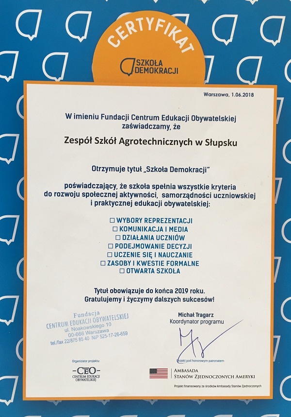 Mamy zaszczyt poinformować, że nasz szkoła zdobyła certyfikat „Szkoły Demokracji”. Wyróżnienie to przyznawane jest przez Centrum Edukacji Obywatelskiej w Warszawie. Od września 2017 r. Samorząd Uczniowski przy wsparciu nauczycieli- p. Anety Pietrowskiej Śnieguli i p. Karoliny Tandeckiej realizował wyzwania w obszarach tj. Wybory reprezentacji, Działania uczniów, Podejmowanie decyzji, Komunikacja i media, Uczenie i nauczanie, Zasoby i kwestie formalne, Otwarta szkoła. Certyfikat poświadcza zatem, że nasz szkoła spełnia wszystkie kryteria niezbędne do rozwoju społecznej aktywności, samorządności uczniowskiej i praktycznej edukacji obywatelskiej.