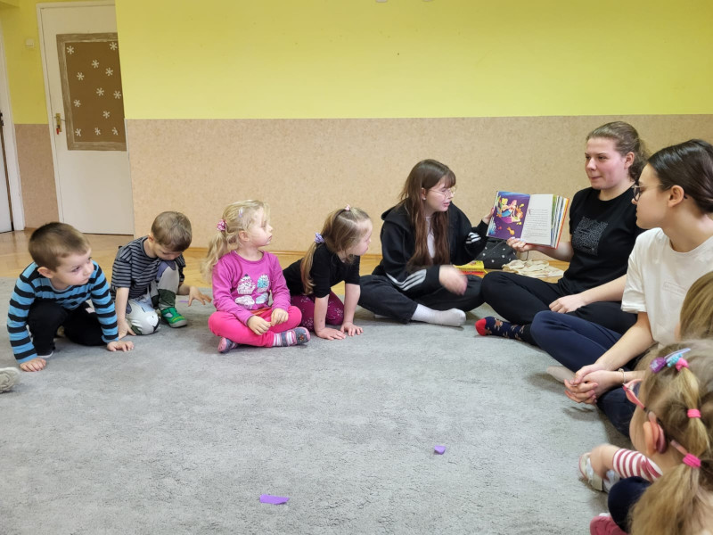 Dominika Płoszaj, Julia Rosiak i Nikola Zawadka ze Szkolnego Klubu Wolontariusza wybrały się we wtorek (20.02.2024) do Przedszkola Miejskiego Integracyjnego nr 8 ,,Zamek Skarbów" w Słupsku gdzie czytały najmłodszym książki i prowadziły rozmowy na temat czytanego tekstu.