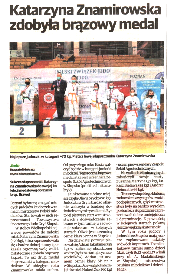 Nasza uczennica, Kasia Znamirowska (kl. 2KA5), zawodniczka TS Judo Gryf Słupsk, zdobyła brązowy medal w Mistrzostwach Polski Młodzików i Młodziczek w Judo - 11-13.12.2020 Poznań. Gratulujemy kolejnego sukcesu! W ubiegłym roku Kasia także stała na podium, zdobywając srebro.