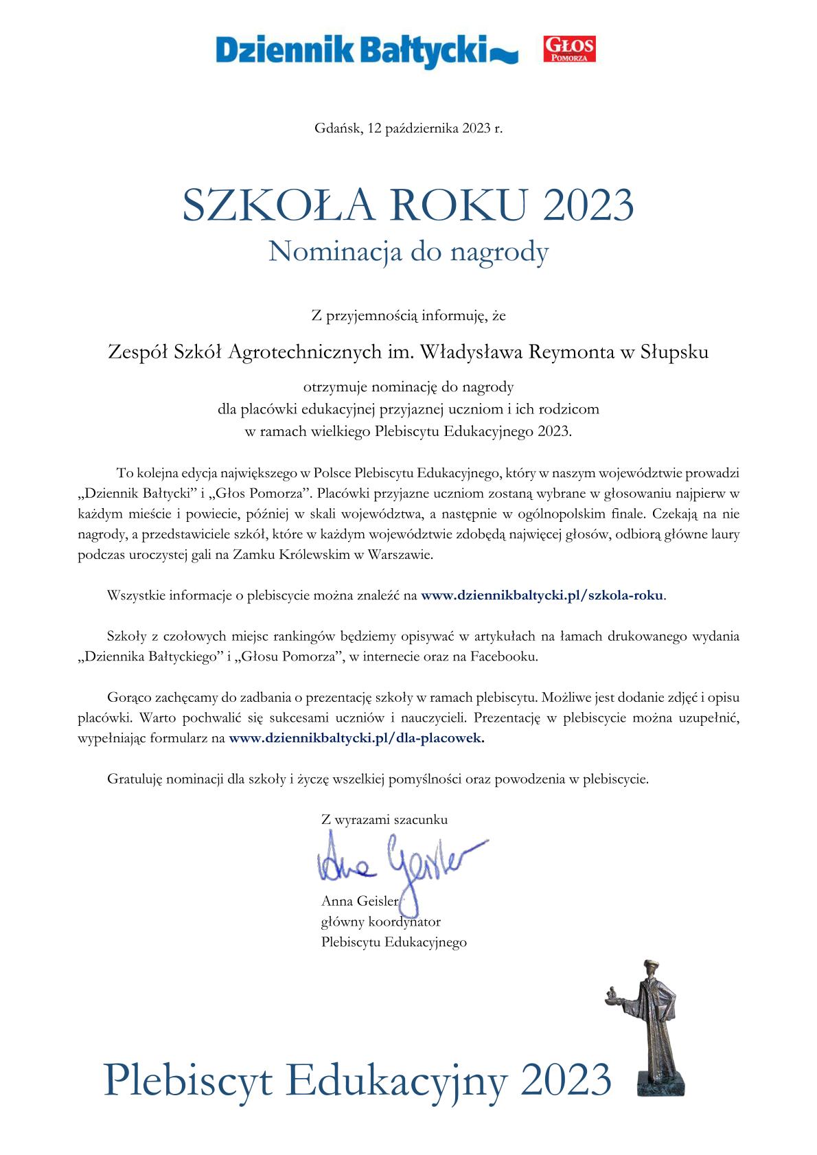 Nasza szkoła została zgłoszona przez uczniów i ich rodziców do nagrody w tegorocznej edycji Plebiscytu Edukacyjnego 2023, który organizuje redakcja "Dziennika Bałtyckiego" i "Głosu Pomorza"!