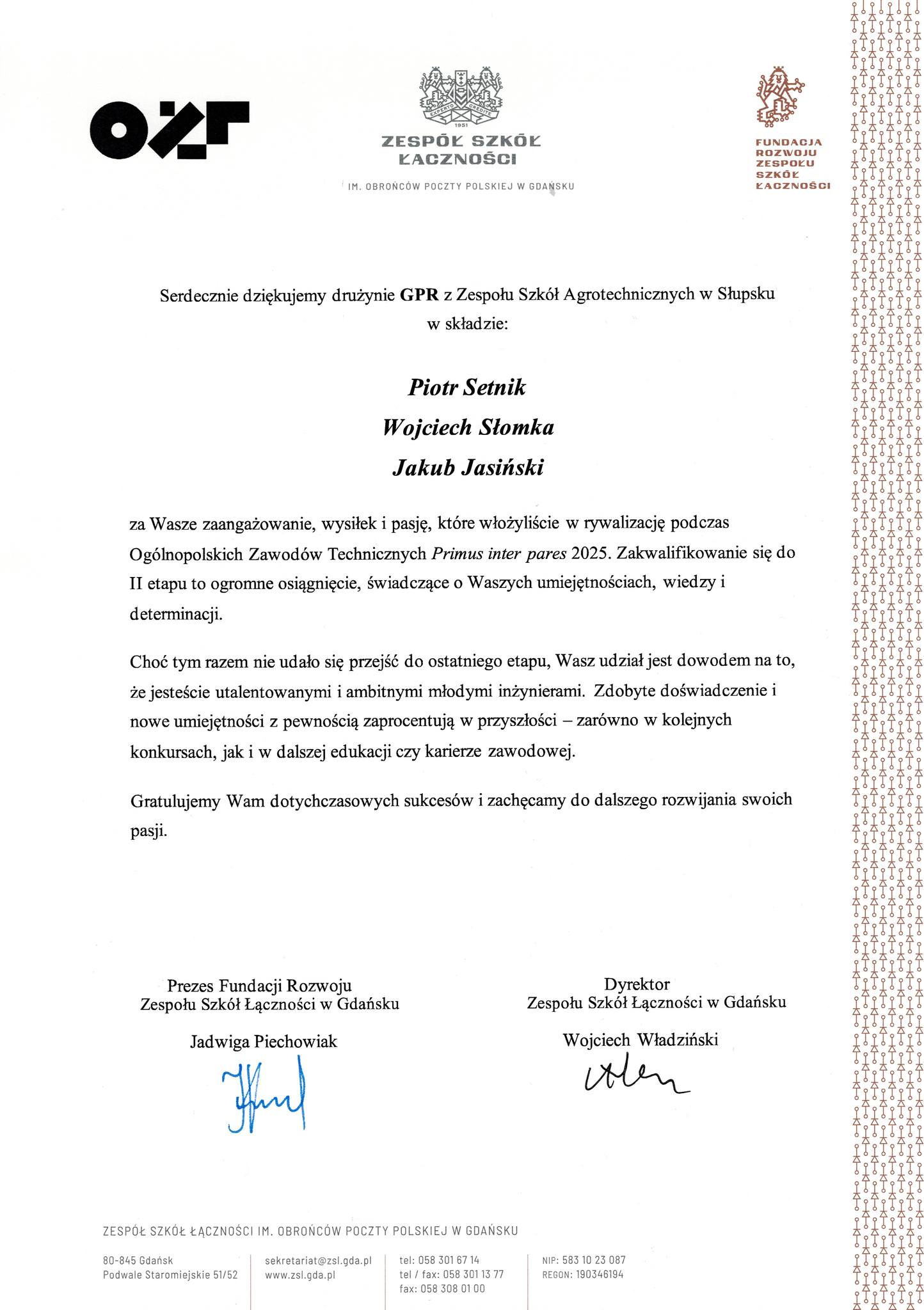 Z dumą informujemy, że uczniowie 4. klasy technik informatyk: Piotr Setnik, Wojciech Słomka oraz Jakub Jasiński zakwalifikowali się do drugiego etapu Ogólnopolskich Zawodów Technicznych Primus inter pares 2025. Pomimo, że do kolejnego etapu już nie awansowali, to i tak odnieśli spory sukces. Gratulujemy! Drużyną opiekował się Marcin Kisielewski - nauczyciel informatycznych przedmiotów zawodowych.