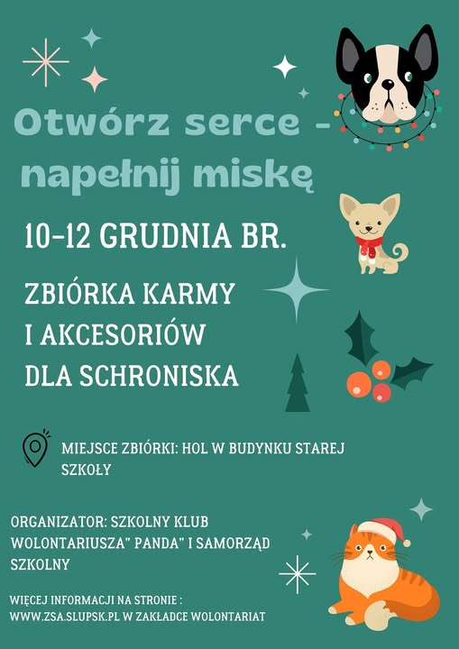 W dniach 10-13 grudnia wolontariusze z naszego klubu zorganizowali w szkole zbiórkę karmy i akcesoriów dla zwierząt przebywających w schronisku. Prowadziliśmy tą akcję wspólnie z Samorządem Szkolnym.