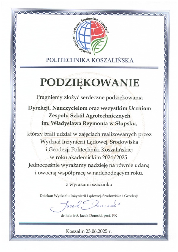 Witaj na stronie Zespołu Szkół Agrotechnicznych im. Władysława Reymonta w Słupsku. Zapraszamy do zapoznania się z ofertą kształcenia oraz aktualnościami szkolnymi.