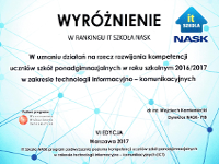 IT Szkoła to internetowy, otwarty program studiów e-learningowych w zakresie teorii oraz zastosowań technologii informacyjno-komunikacyjnych (ICT). W programie uczestniczymy już kilka lat i z powodzeniem korzystamy z bogatych zasobów kursów i szkoleń IT Szkoła oraz z dostępu do Microsoft Imagine Premium (bezpłatny dostęp do oprogramowania Microsoft dla uczniów). Już trzeci raz dobywamy wyróżnienie w ogólnopolskim rankingu IT Szkoły.