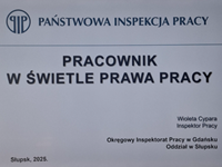 W roku szkolnym 2024/2025 w kwietniu uczniowie naszej szkoły uczestniczyli w kolejnej edycji ogólnopolskiego programu edukacyjnego „KULTURA BEZPIECZEŃSTWA”. Prelekcje, których tematem było "Pracownik w świetlne prawa pracy", przeprowadziła Inspektor Pracy Okręgowego Inspektoratu Pracy w Gdańsku, Oddział w Słupsku, pani Wioleta Cypara. W spotkaniu uczestniczyli uczniowie klas trzecich kierunków branży informatycznej (programiści i informatycy), urządzeń i systemów energetyki odnawialnej, geodezji oraz młodzież klasy drugiej architektury krajobrazu i ochrony środowiska.