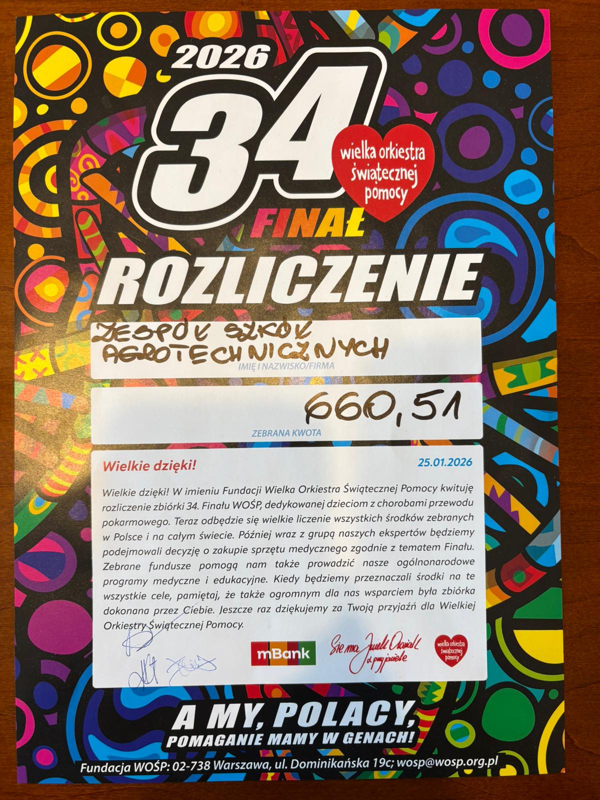 W 2026 roku Zespół Szkół Agrotechnicznych po raz kolejny włączył się w ogólnopolską akcję Wielkiej Orkiestry Świątecznej Pomocy, grając podczas 34. Finału WOŚP. Dzięki zaangażowaniu uczniów, nauczycieli oraz całej społeczności szkolnej udało się zebrać kwotę 660,51 zł, która została przekazana na wsparcie dzieci z chorobami przewodu pokarmowego.