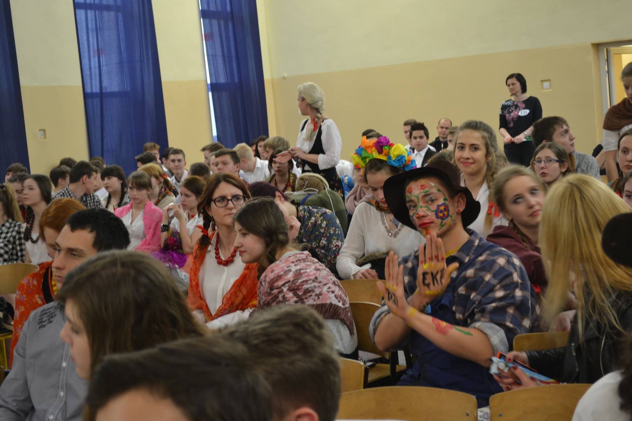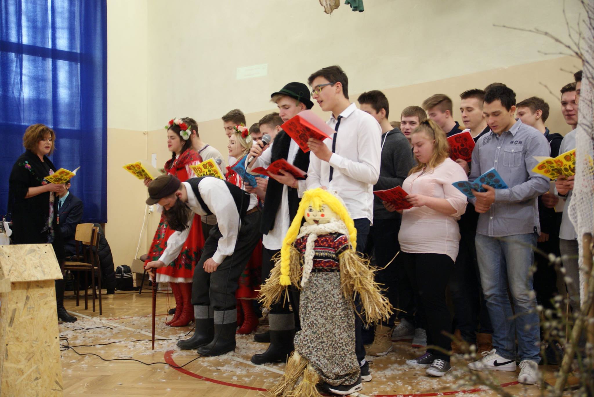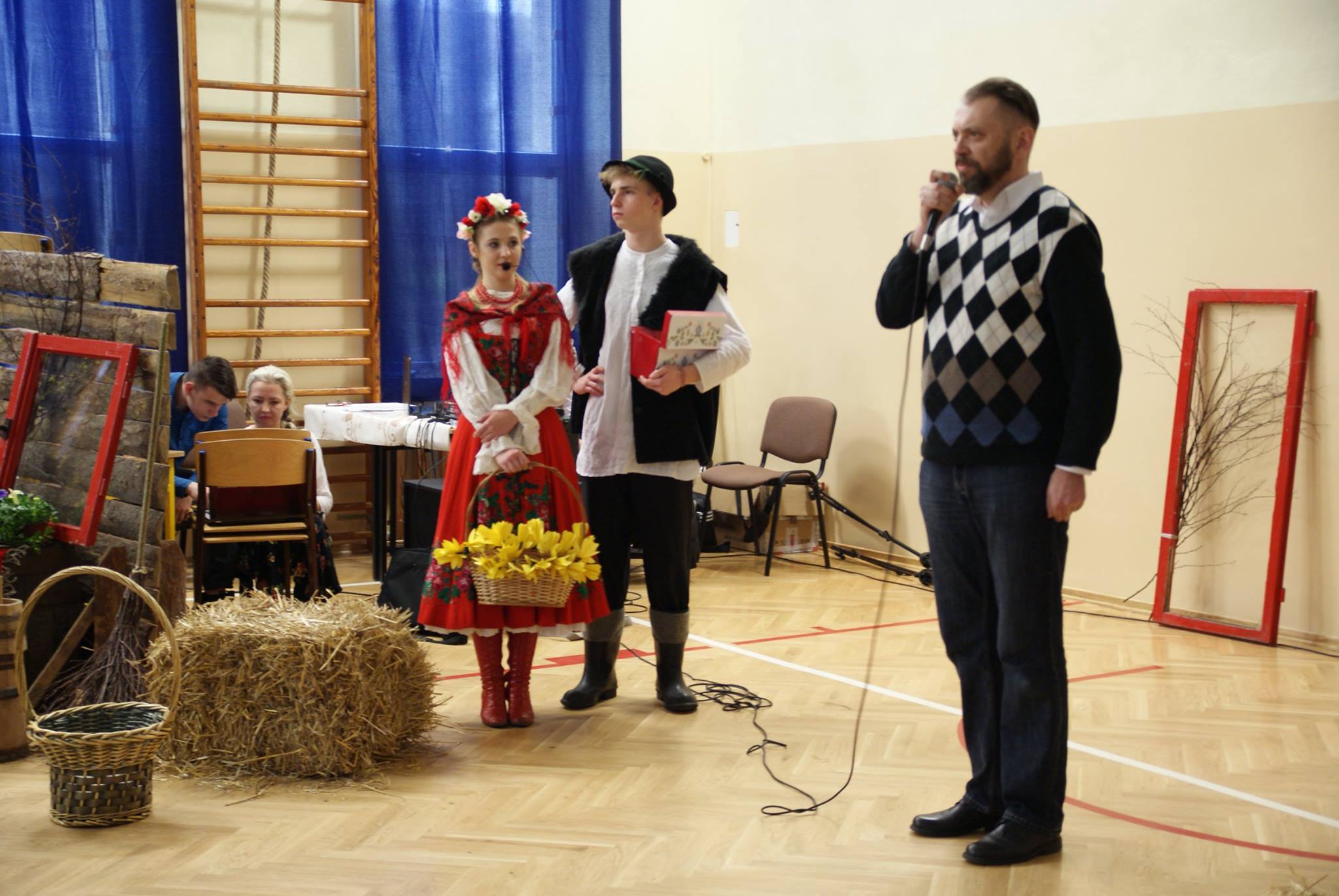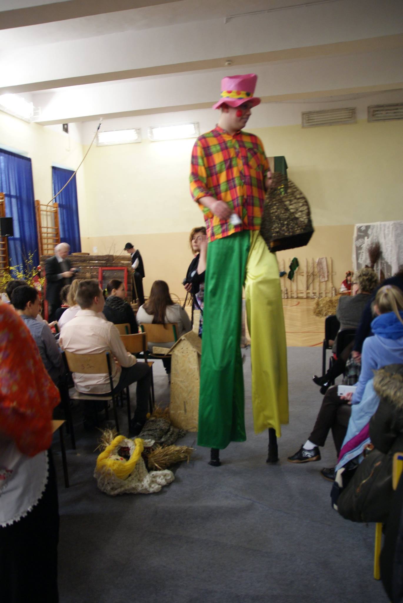 Inscenizacja wystawiona przez koło teatralne "Świta Królowej" oparta była na Reymontowskich "Chłopach". Grupa przebrana w piękne, ludowe stroje, brawurowo wykonała piosenki oraz zilustrowała słowno-muzycznymi scenkami prezentacje klas pierwszych na zadane tematy. Pomysłowa forma, humor oraz temat omawianych przez pierwszaków zagadnień przykuły uwagę widowni, która nagradzała referujących gromkimi brawami. Ciekawy był pomysł na owe prezentacje - wynikał ze specjalizacji poszczególnych klas. I tak, np. informatycy - opowiadali o przepływie informacji dawniej i dziś; architekci krajobrazu i analitycy - o ziołach w ogrodzie Hanki, szeptuchach, wiedźmach, znachorkach. Geodeci omówili rolę ziemi w życiu chłopskiej gromady, technicy energii odnawialnej - przybliżyli pracę młynarza i rolę młyna we wsi, żywieniowcy zaś mówili o jedzeniu - powszednim, przaśnym i specjałach wielkanocnych. Swój wkład w imprezę miało również Centrum Edukacji Regionalnej. Artysta ludowy pan Zenon Frąckiewicz, zaprezentował wystawę rzeźb. Uczniowie mogli zobaczyć, jak powstaje dzieło sztuki. Mieli możliwość chwycić za dłuto i spróbować swoich sił w tym zakresie. Kilku z nich zapisało się na zajęcia do pracowni rzeźbiarskiej prowadzonej przez Centrum Edukacji Regionalnej. Imprezę uświetniła pani Aldona Peplińska wraz z koleżankami. Pod ich bacznym okiem uczniowie stworzyli piękne pisanki, które dekorować będą świąteczne stoły. Pani Aldona zaprezentowała również swoje wiersze z najnowszego tomiku "Na słomkowym dywanie".