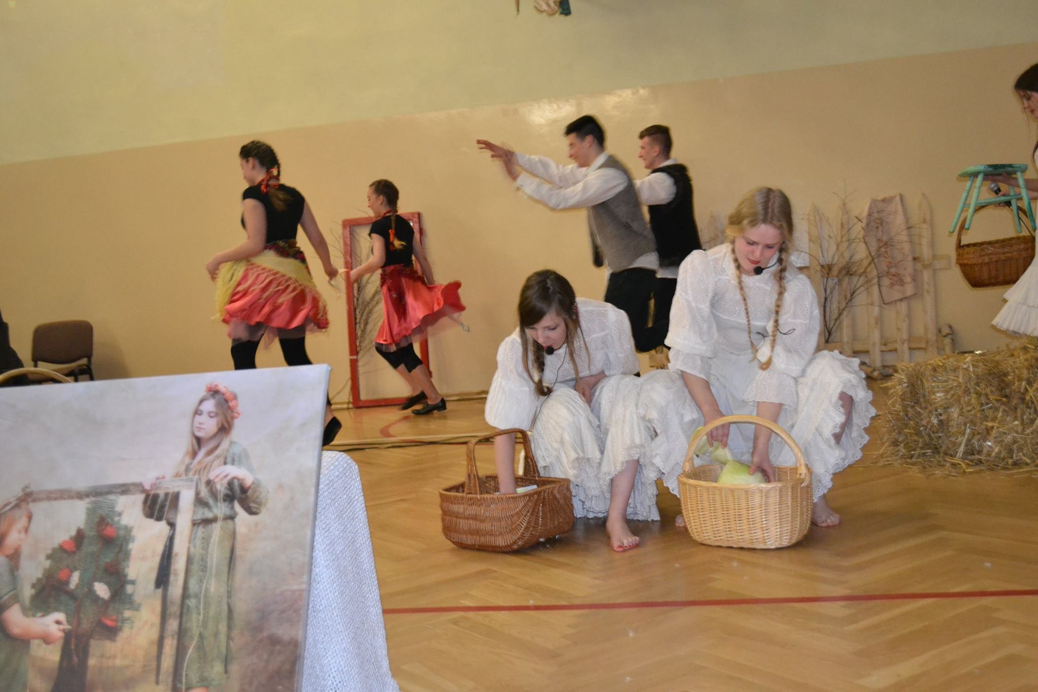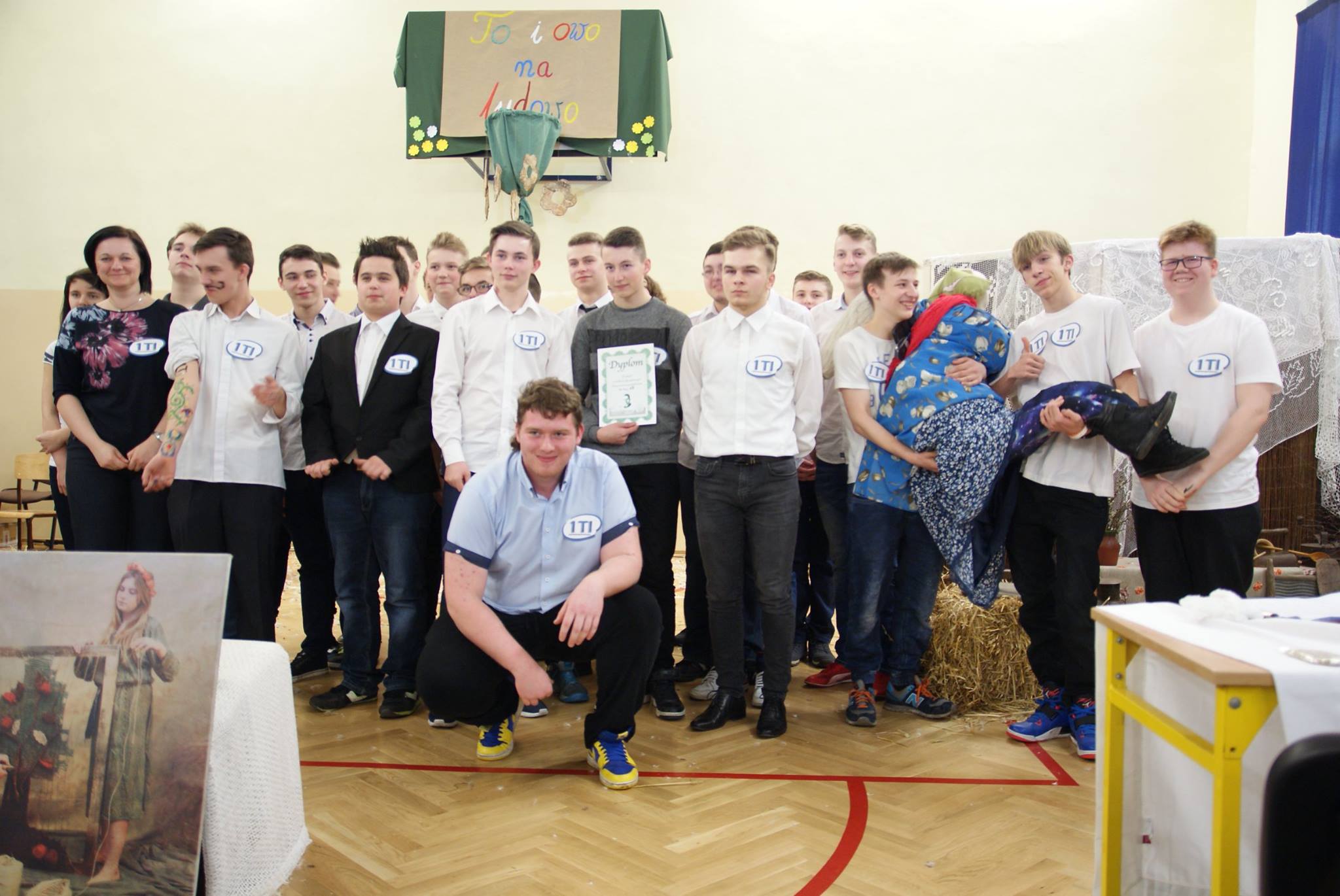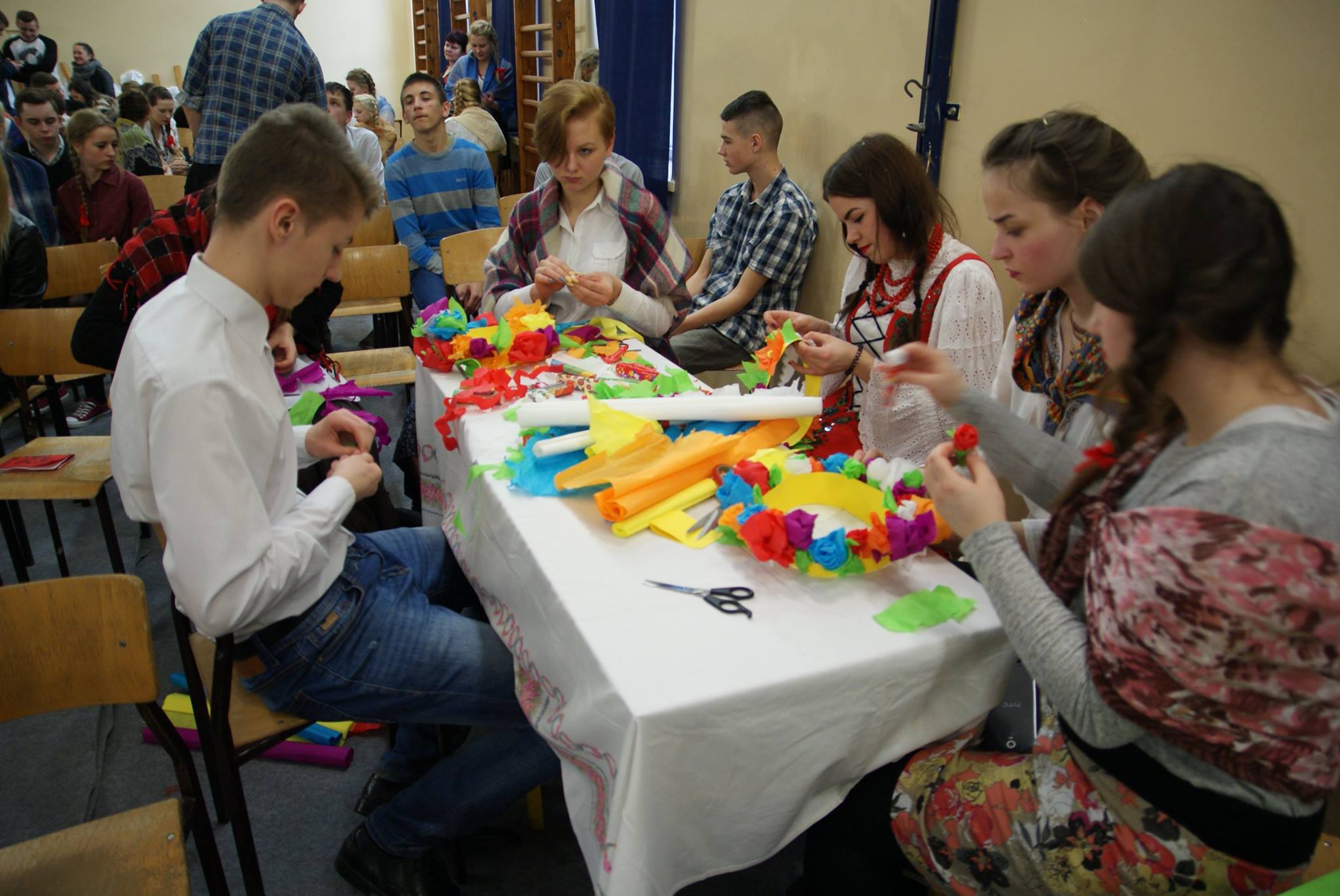 Inscenizacja wystawiona przez koło teatralne "Świta Królowej" oparta była na Reymontowskich "Chłopach". Grupa przebrana w piękne, ludowe stroje, brawurowo wykonała piosenki oraz zilustrowała słowno-muzycznymi scenkami prezentacje klas pierwszych na zadane tematy. Pomysłowa forma, humor oraz temat omawianych przez pierwszaków zagadnień przykuły uwagę widowni, która nagradzała referujących gromkimi brawami. Ciekawy był pomysł na owe prezentacje - wynikał ze specjalizacji poszczególnych klas. I tak, np. informatycy - opowiadali o przepływie informacji dawniej i dziś; architekci krajobrazu i analitycy - o ziołach w ogrodzie Hanki, szeptuchach, wiedźmach, znachorkach. Geodeci omówili rolę ziemi w życiu chłopskiej gromady, technicy energii odnawialnej - przybliżyli pracę młynarza i rolę młyna we wsi, żywieniowcy zaś mówili o jedzeniu - powszednim, przaśnym i specjałach wielkanocnych. Swój wkład w imprezę miało również Centrum Edukacji Regionalnej. Artysta ludowy pan Zenon Frąckiewicz, zaprezentował wystawę rzeźb. Uczniowie mogli zobaczyć, jak powstaje dzieło sztuki. Mieli możliwość chwycić za dłuto i spróbować swoich sił w tym zakresie. Kilku z nich zapisało się na zajęcia do pracowni rzeźbiarskiej prowadzonej przez Centrum Edukacji Regionalnej. Imprezę uświetniła pani Aldona Peplińska wraz z koleżankami. Pod ich bacznym okiem uczniowie stworzyli piękne pisanki, które dekorować będą świąteczne stoły. Pani Aldona zaprezentowała również swoje wiersze z najnowszego tomiku "Na słomkowym dywanie".