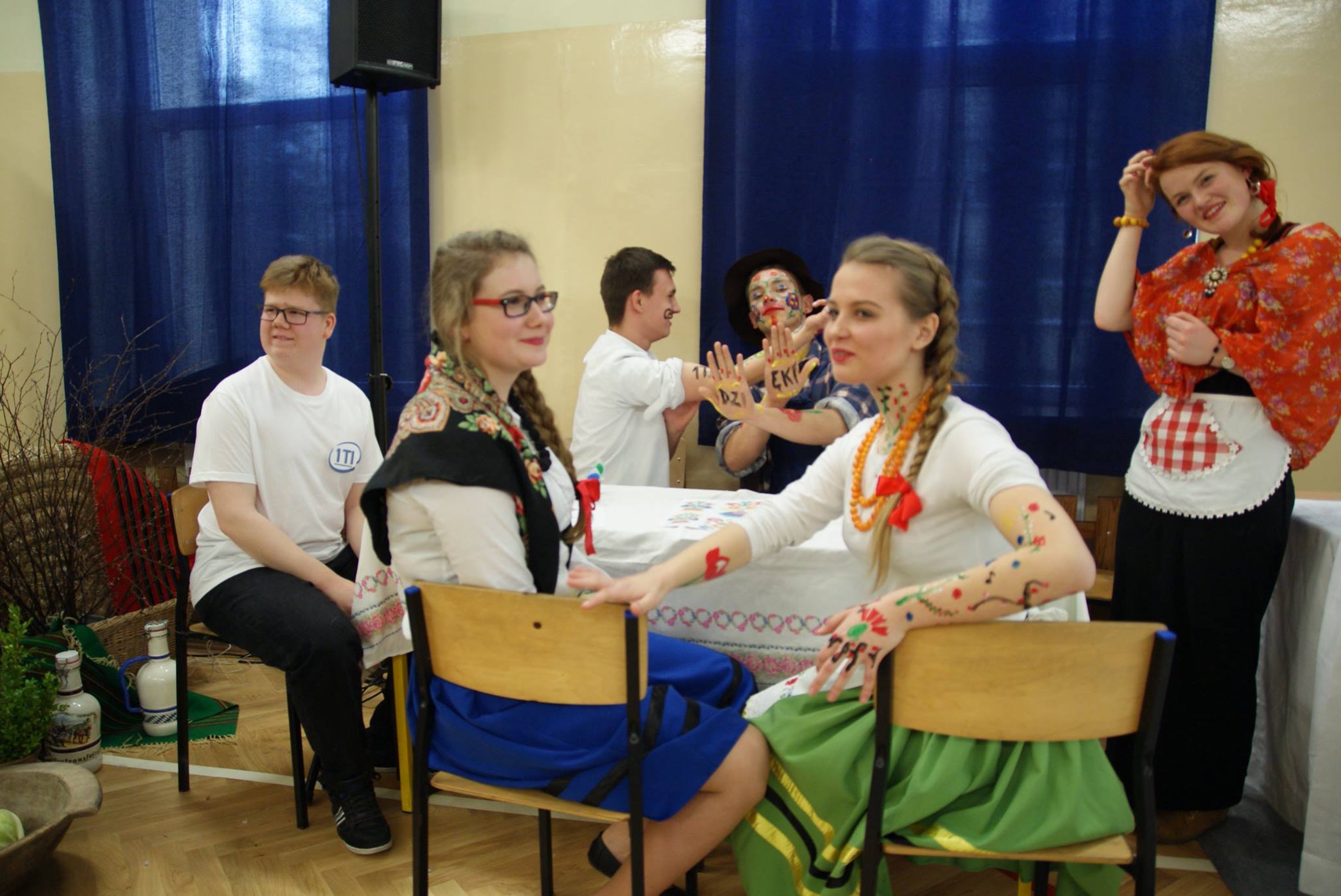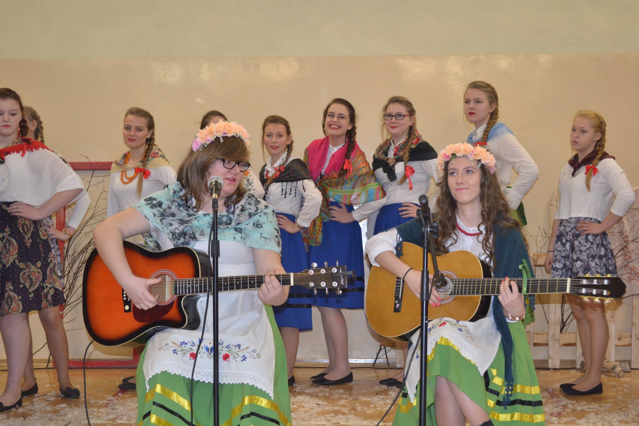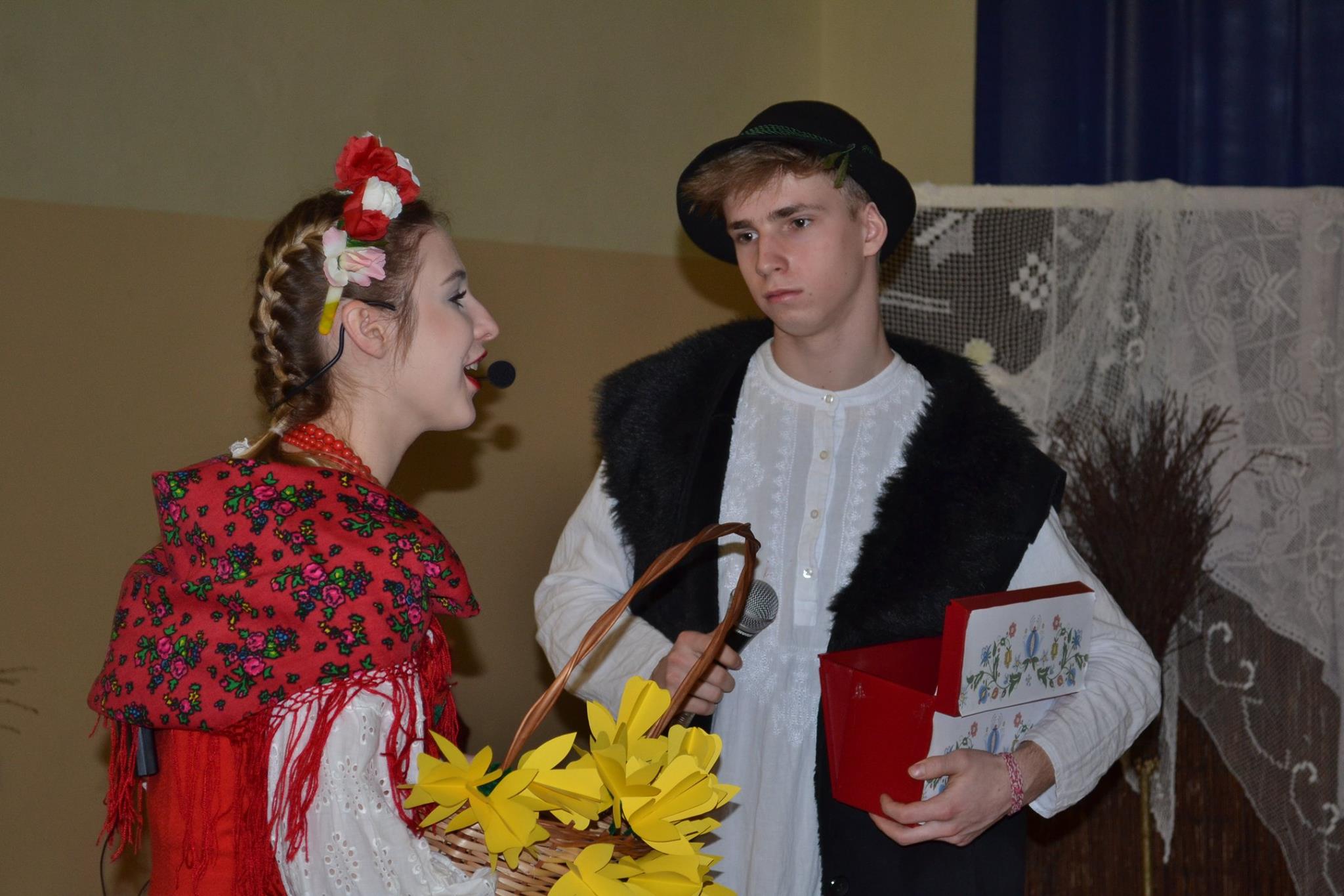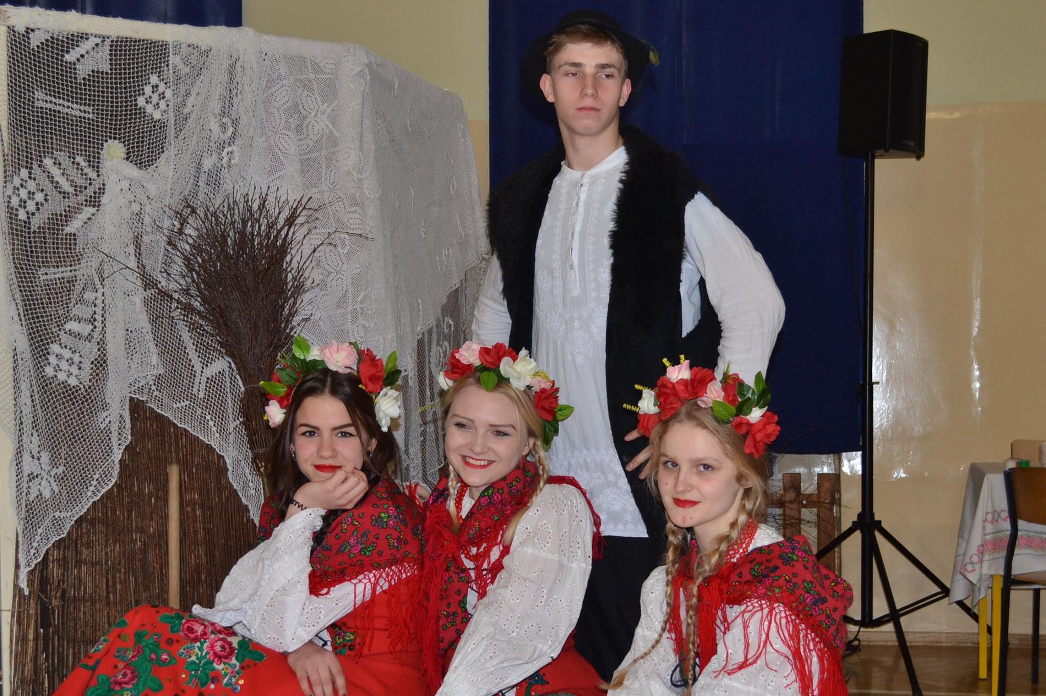 Inscenizacja wystawiona przez koło teatralne "Świta Królowej" oparta była na Reymontowskich "Chłopach". Grupa przebrana w piękne, ludowe stroje, brawurowo wykonała piosenki oraz zilustrowała słowno-muzycznymi scenkami prezentacje klas pierwszych na zadane tematy. Pomysłowa forma, humor oraz temat omawianych przez pierwszaków zagadnień przykuły uwagę widowni, która nagradzała referujących gromkimi brawami. Ciekawy był pomysł na owe prezentacje - wynikał ze specjalizacji poszczególnych klas. I tak, np. informatycy - opowiadali o przepływie informacji dawniej i dziś; architekci krajobrazu i analitycy - o ziołach w ogrodzie Hanki, szeptuchach, wiedźmach, znachorkach. Geodeci omówili rolę ziemi w życiu chłopskiej gromady, technicy energii odnawialnej - przybliżyli pracę młynarza i rolę młyna we wsi, żywieniowcy zaś mówili o jedzeniu - powszednim, przaśnym i specjałach wielkanocnych. Swój wkład w imprezę miało również Centrum Edukacji Regionalnej. Artysta ludowy pan Zenon Frąckiewicz, zaprezentował wystawę rzeźb. Uczniowie mogli zobaczyć, jak powstaje dzieło sztuki. Mieli możliwość chwycić za dłuto i spróbować swoich sił w tym zakresie. Kilku z nich zapisało się na zajęcia do pracowni rzeźbiarskiej prowadzonej przez Centrum Edukacji Regionalnej. Imprezę uświetniła pani Aldona Peplińska wraz z koleżankami. Pod ich bacznym okiem uczniowie stworzyli piękne pisanki, które dekorować będą świąteczne stoły. Pani Aldona zaprezentowała również swoje wiersze z najnowszego tomiku "Na słomkowym dywanie".