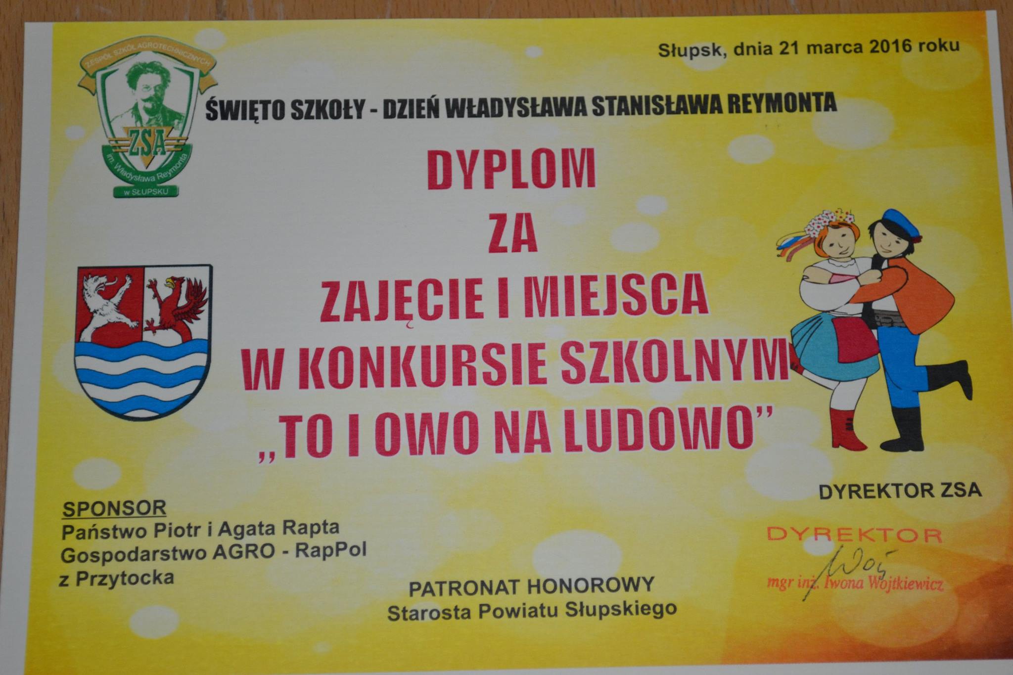 Pierwszy dzień wiosny Zespól Szkół Agrotechnicznych w Słupsku przywitał na ludową nutę. Dosłownie i w przenośni. 21 marca miało miejsce Święto Szkoły. Uczniowie i nauczyciele uczcili pamięć patrona - W. St. Reymonta - stylizując to wydarzenia na realia XIX-wiecznej wsi polskiej. Patronat nad uroczystością objął Starosta Powiatu Słupskiego - Zdzisław Kołodziejski. Swoją obecnością szkolną społeczność zaszczycili: radny Powiatu Słupskiego - Paweł Lisowski, dyrektor Muzeum Pomorza Środkowego - Marzenna Mazur, dyrektor Centrum Edukacji Regionalnej - Mariusz Smoliński. Imprezę otworzyła dyrektor ZSA - Iwona Wojtkiewicz.