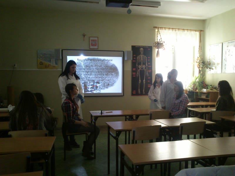 w odpowiednie stroje i posiadała ciekawe rekwizyty. Uczestnicy podawali w żartobliwy i przystępny sposób dużo ciekawych informacji na temat GMO,przedstawili wady i zalety wykorzystywania organizmów modyfikowanych genetycznie, wykonywali różne doświadczenia, takie jak: pobieranie odcisków palców, testy DNA. Całość dowiodła, że można się świetnie bawić, a jednocześnie wiele nauczyć.A co za tym idzie? Biologia wcale nie jest straszna!