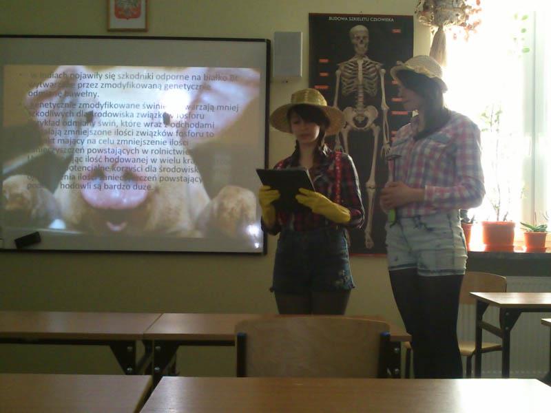 W kwietniu odbyła się seria przedstawień na temat GMO (Genetically Modified Organisms) czyli organizmów genetycznie modyfikowanych. Zdarzenie miało miejsce w klasie biologicznej Pani mgr Marii Perz, która była również pomysłodawczynią całego przedsięwzięcia. Udział brały wszystkie klasy pierwsze. Przedstawienia były bardzo interesujące, każda grupa ubrana była
