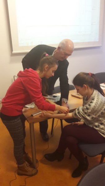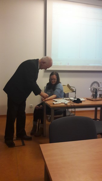 "Elektryczność w biologii". Zasady bezpiecznego korzystania z energii elektrycznej, zapoznanie z zasadami działania i obsługą aparatury do badań elektrofizjologicznych, pomiar szybkości fali tętna w oparciu o rejestrację EKG i pulsu, pomiar czasu reakcji na bodziec mechaniczny, wzrokowy i słuchowy w różnych stanach uwagi osoby badanej, czas reakcji w odruchu kolanowym, śmieszne gesty – stymulacja elektryczna nerwów palców dłoni, rejestracja aktywności elektrycznej mięśni dłoni (emg) podczas sterowanej "mózgowo" i wymuszonej elektrycznie aktywności palców dłoni.
