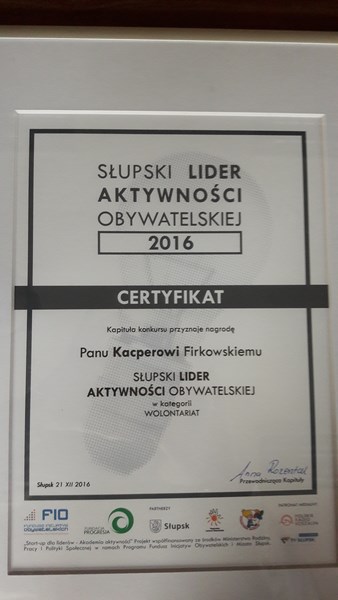 Uroczysta Gala konkursu „Słupski Lider Aktywności Obywatelskiej 2016 ” odbyła się 21 grudnia 2016 r. w Polskiej Filharmonii Sinfonia Baltica w Słupsku. Konkurs organizowany był w ramach projektu „Start-up dla Liderów Akademii Aktywności” współfinansowanego ze Środków Ministerstwa Rodziny, Pracy i Polityki Społecznej w ramach Programu Fundusz Inicjatyw Obywatelskich. Kapituła konkursu przyznała nagrody w 6 kategoriach: