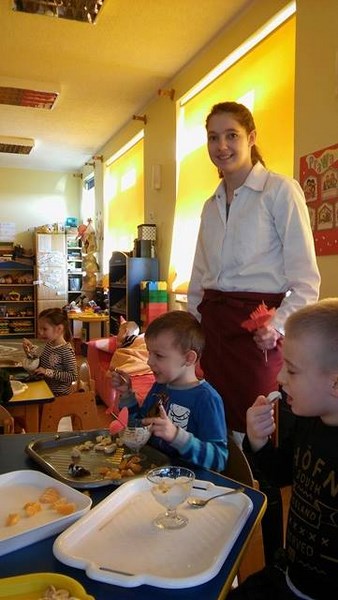 16 lutego 2017r. w ramach realizacji całorocznego projektu „Zdrowe Drugie Śniadanie” uczennice z klasy 1 TUŻ wspólnie z wolontariuszkami Słupskiego Uniwersytetu Trzeciego Wieku przygotowały kulinarne warsztaty dla dzieci z Przedszkola Integracyjnego nr 8 w Słupsku pod hasłem „Walentynkowe desery”. Atrakcją dla przedszkolaków było poznanie tajników przygotowania zdrowych deserów z surowych i suszonych owoców oraz jogurtu naturalnego. Dzieci po uprzednim, krótkim „przeszkoleniu” zamieniły się w małych kucharzy. Własnoręcznie przygotowywali oni swoje desery i zdobili je czerwonymi serduszkami. Później odbyła się degustacja przygotowanych smakołyków.