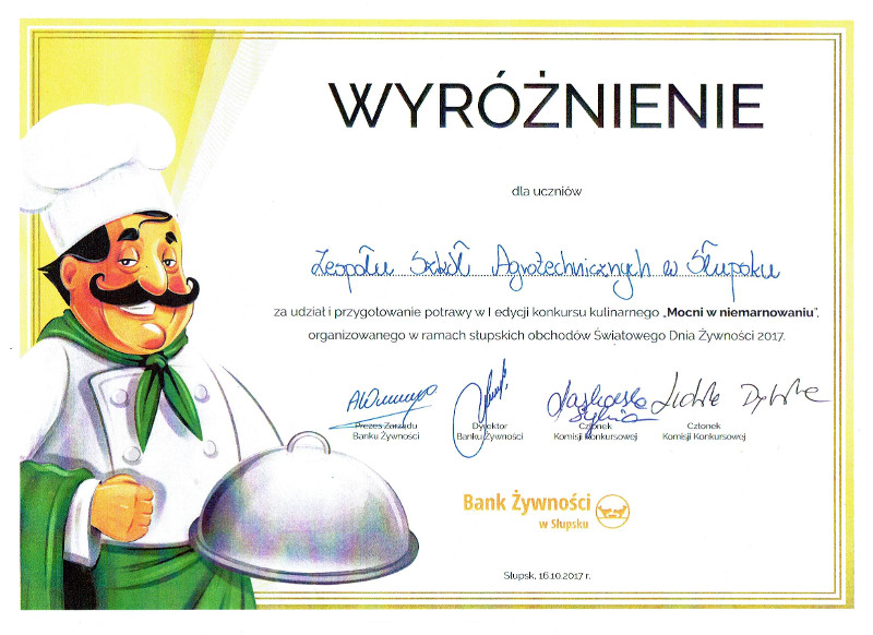 W konkursie kulinarnym „Mocni w niemarnowaniu”. Wiktoria Bąkowska i Krystian Kozłowski z klasy 2 TUŻ otrzymali wyróżnienie za przygotowanie potrawy w I edycji konkursu kulinarnego „Mocni w niemarnowaniu”. Celem konkursu było promowanie idei niemarnowania żywności oraz wyłonienie najciekawszej potrawy, której produktem bazowym był makaron. Organizatorem konkursu był Bank Żywności w Słupsku.