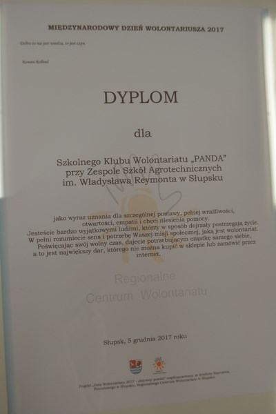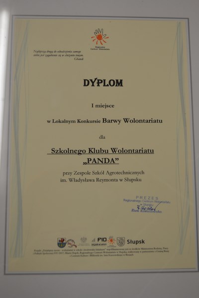 I miejsce w konkursie BARWY WOLONTARIATU w kategorii OCHRONA ZDROWIA / NIEPEŁNOSPRAWNOŚĆ otrzymał Szkolny Klub Wolontariusza „PANDA” przy Zespole Szkół Agrotechnicznych im. Wł. Reymonta w Słupsku.