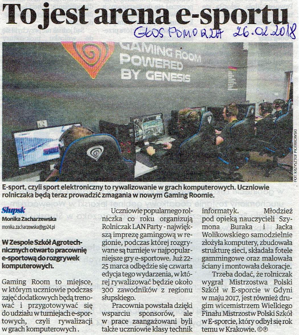 W lutym b.r. w Rolniczaku, dzięki wsparciu Starosty Słupskiego, Pana Zdzisława Kołodziejskiego, przychylności Dyrektor Zespołu Szkół Agrotechnicznych, Pani Iwony Wojtkiewicz oraz współpracy z marką gamingową Genesis, powstał Gaming Room - miejsce, w którym uczniowie podczas zajęć dodatkowych, pod nadzorem nauczycieli, będą trenować i przygotowywać się do udziału w turniejach esportowych.