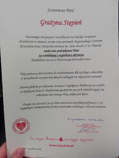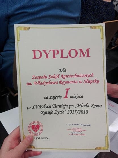 Dnia 03.12.2018 w Słupsku w Inkubatorze Technologicznym odbyła się gala zorganizowana przez Centrum Krwiodawstwa i Krwiolecznictwa z okazji 60-cio lecia Honorowego Krwiodawstwa w Polsce. Duży zaszczyt spotkał naszą szkołę. Zajęliśmy I miejsce w ogólnopolskim konkursie "Twoja krew-moje życie". W roku szkolnym 2017/2018 nasi uczniowie oddali najwięcej krwi wśród uczniów szkół ponadgimnazjalnych. Bardzo Wam za to dziękujemy!