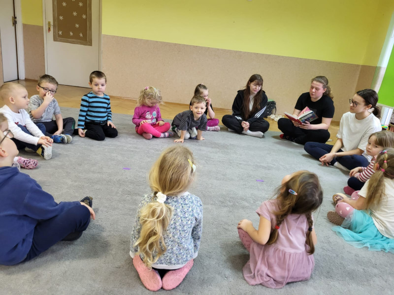 Dominika Płoszaj, Julia Rosiak i Nikola Zawadka ze Szkolnego Klubu Wolontariusza wybrały się we wtorek (20.02.2024) do Przedszkola Miejskiego Integracyjnego nr 8 ,,Zamek Skarbów" w Słupsku gdzie czytały najmłodszym książki i prowadziły rozmowy na temat czytanego tekstu.