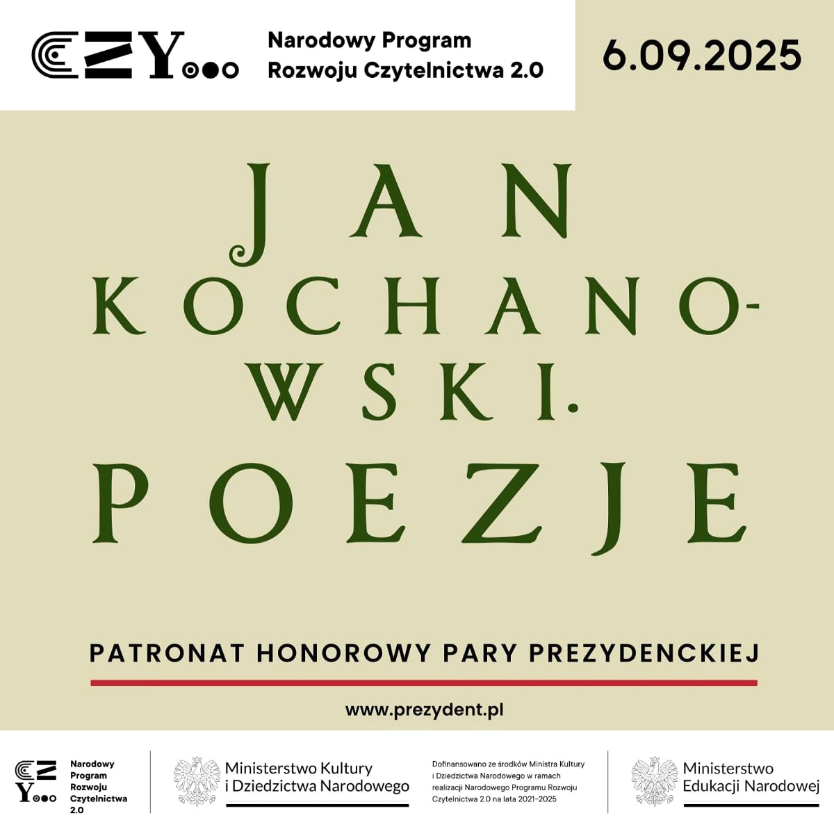 Prezydent Rzeczypospolitej Polskiej Karol Nawrocki wraz z Małżonką Martą Nawrocką zapraszają do udziału w Narodowym Czytaniu poezji Jana Kochanowskiego. Finał akcji odbywa się 6 września 2025 roku.