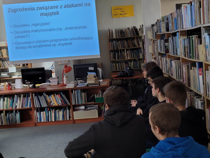 2 marca uczniowie klasy 1 technik programista brali udział w spotkaniu dotyczącym bezpieczeństwa w sieci internetowej, które odbyło się w Filii nr 5 w Miejskiej Bibliotece Publicznej w Słupsku. Podczas wykładu, który poprowadził przedstawiciel policji mł. aspirant Arkadiusz Matuszyn, młodzież dowiedziała się o najbardziej popularnych zagrożeniach w sieci internetowej.