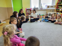 Dominika Płoszaj, Julia Rosiak i Nikola Zawadka ze Szkolnego Klubu Wolontariusza wybrały się we wtorek (20.02.2024) do Przedszkola Miejskiego Integracyjnego nr 8 ,,Zamek Skarbów" w Słupsku gdzie czytały najmłodszym książki i prowadziły rozmowy na temat czytanego tekstu.