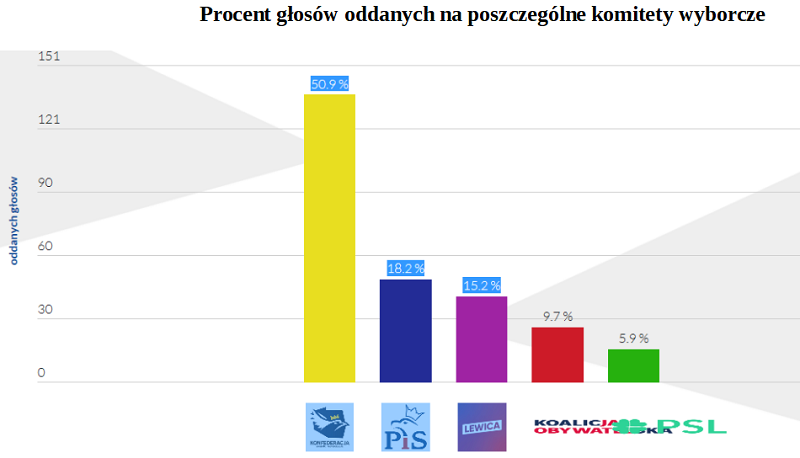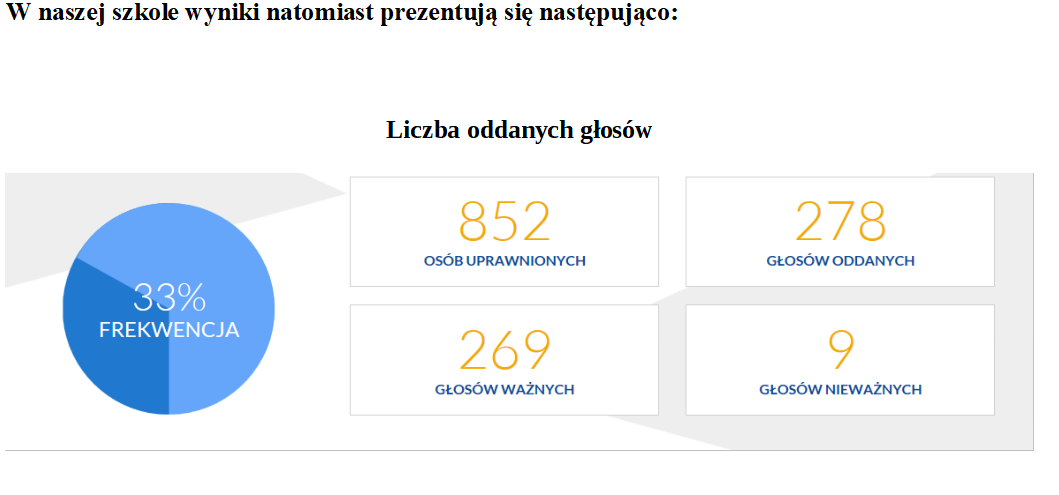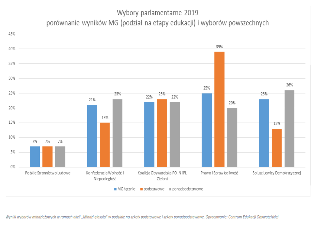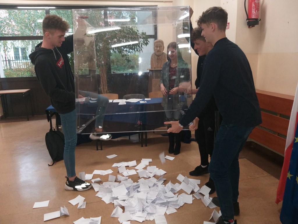 Dnia 07.10.2019 r. w ramach programu „Młodzi Glosują”, organizowanego przez Centrum Edukacji Obywatelskiej, w naszej szkole zostały przeprowadzone prawybory do Parlamentu. Celem akcji było zwiększenie uczestnictwa młodych ludzi w życiu publicznym, w tym zachęcenie ich do świadomego udziału w wyborach. W bieżącej edycji wzięło udział ponad 900 szkół. W sumie w 760 szkołach uprawnionych do głosowania było 211 315 uczniów, zagłosowało 126 921 uczniów – frekwencja wyniosła 60%. Zwycięzcą wyborów zostało Prawo i Sprawiedliwość uzyskując 25% głosów młodzieży, na kolejnych miejscach, zdobywając niewiele mniej głosów, uplasował się Sojusz Lewicy Demokratycznej - 23%, Koalicja Obywatelska - 22% oraz Konfederacja - 21%. Gdyby jednak głosowanie ograniczyć do szkół ponadpodstawowych wyniki byłyby diametralnie różne. Wybory wygrałaby Lewica (26%) przed Konfederacją (23%), Prawo i Sprawiedliwość zdobyłoby zaś tylko 20% i znalazłoby się za Koalicją Obywatelską.