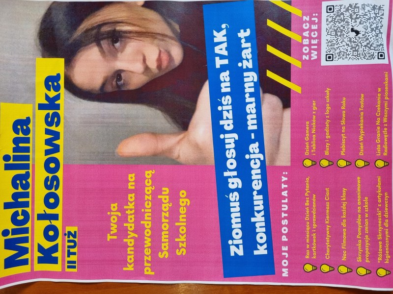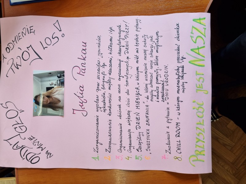 Wybory do Samorządu SzkolnegoOpublikowano: wtorek, 19 październik 2021 08:38 | Aneta Pietrowska-ŚniegulaW dniu 7 października odbyły się wybory do Samorządu Szkolnego. W sumie oddano 610 głosów z czego 19 nieważnych. Wyniki są następujące Oliwer Dubois 288 Kołosowska Michalina 120 Pankau Julia 82 Kołosińska Magdalena 72 Glinka Bartłomiej 29 Gratulujemy.