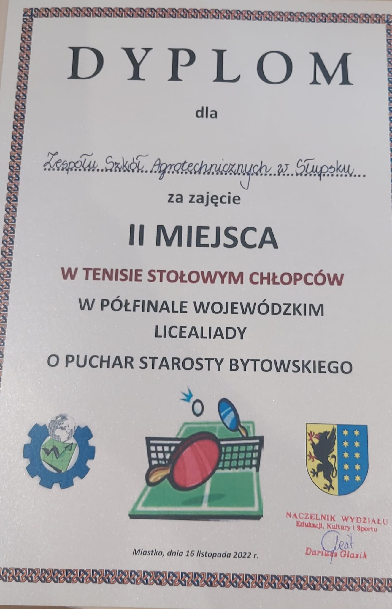 Dnia 16 listopada 2022 roku w Miastku odbył się półfinał wojewódzki w tenisie stołowym. Miło nam poinformować, że nasi reprezentanci w składzie: Łukasz Różkowski z klasy 2KŚ, Wiktor Kwiatkowski z klasy 4 TI i Miłosz Jancz z klasy 4PI4 wywalczli 2 miejsce. Gratulujemy!!!