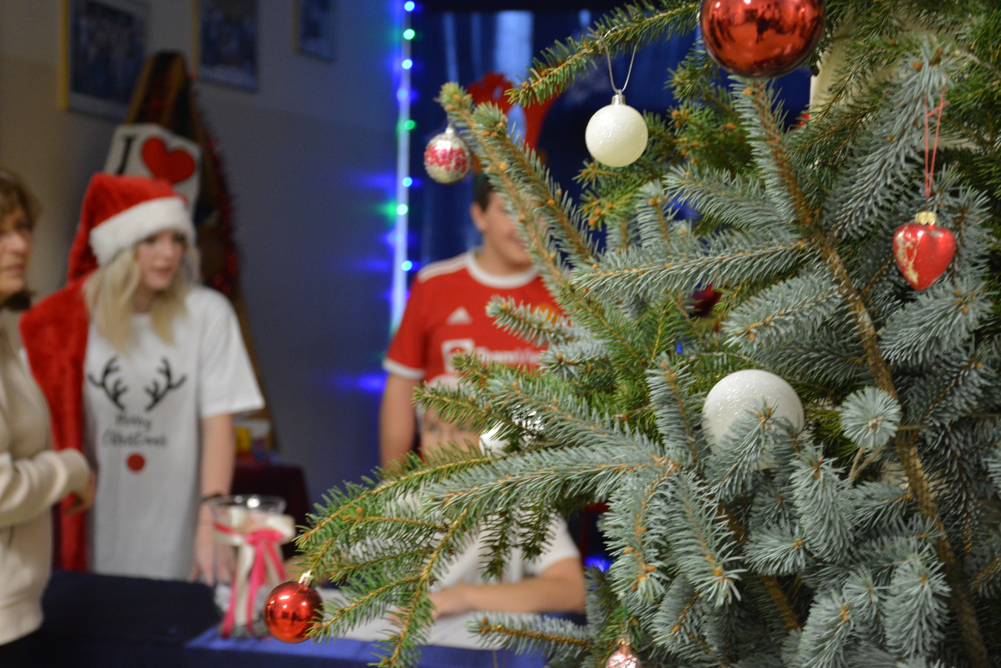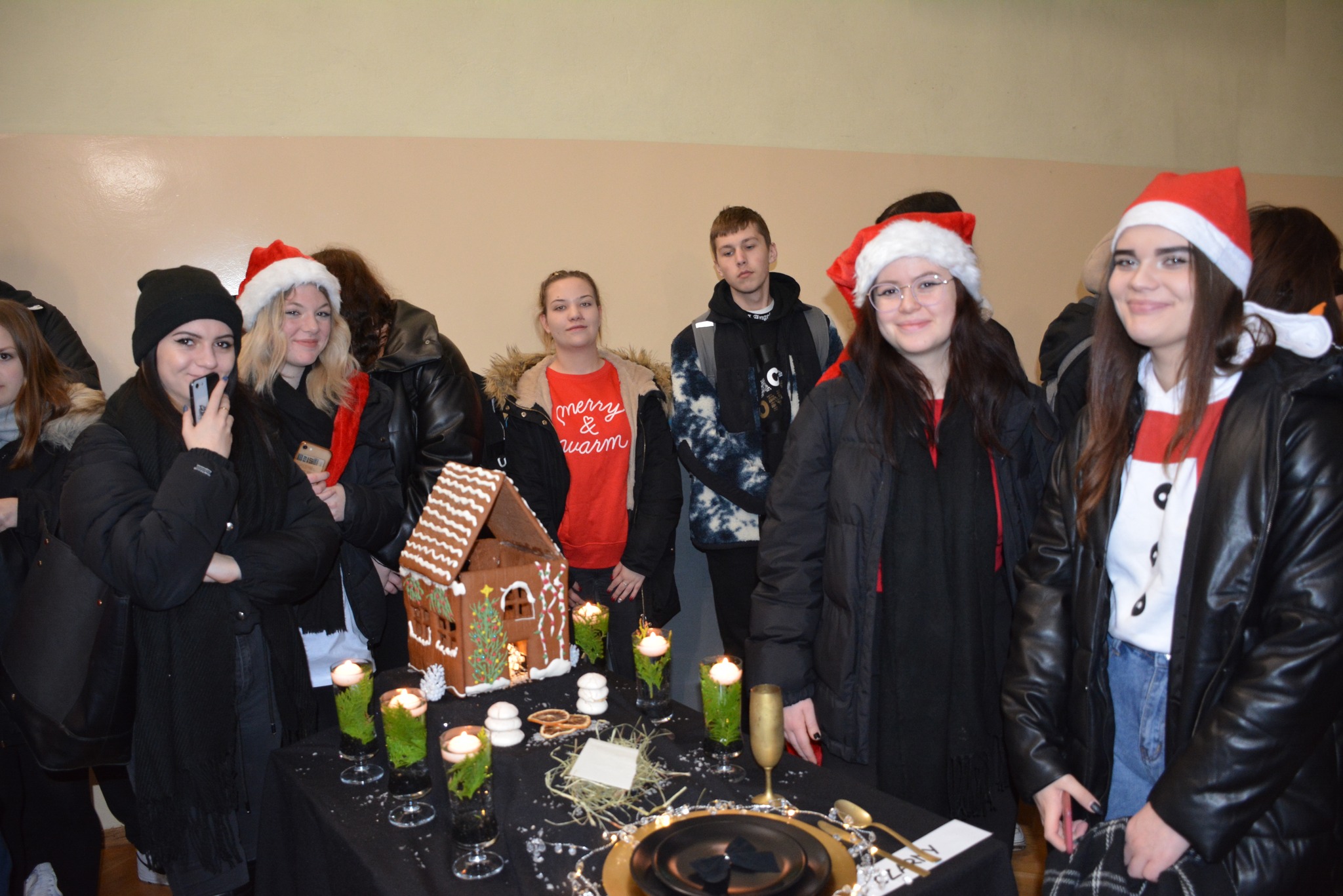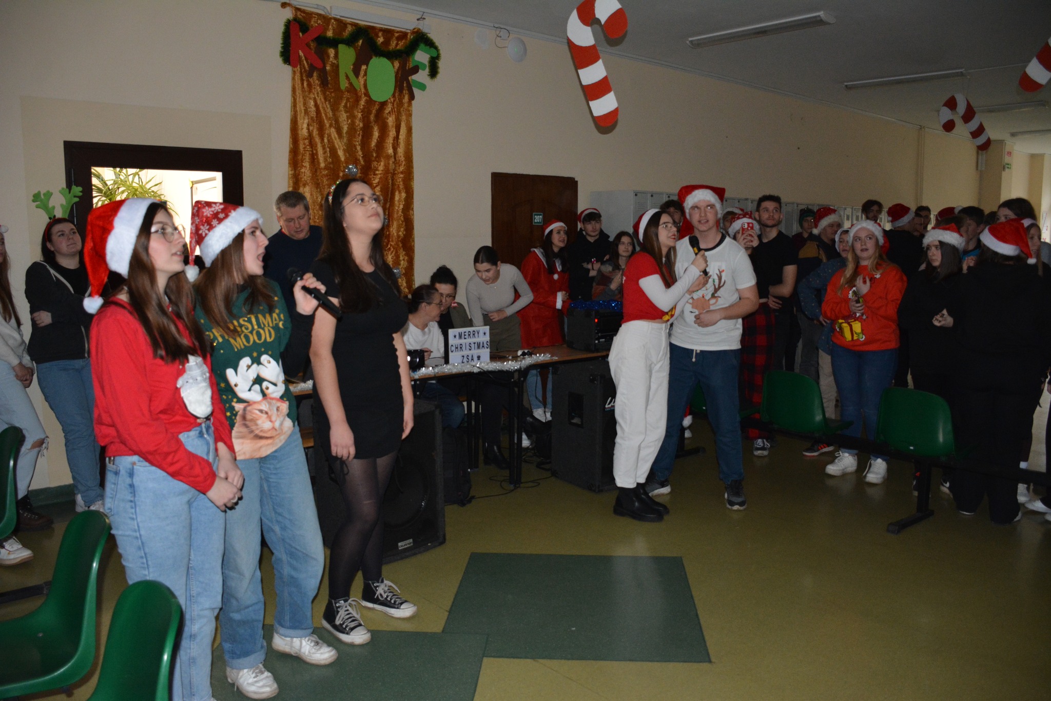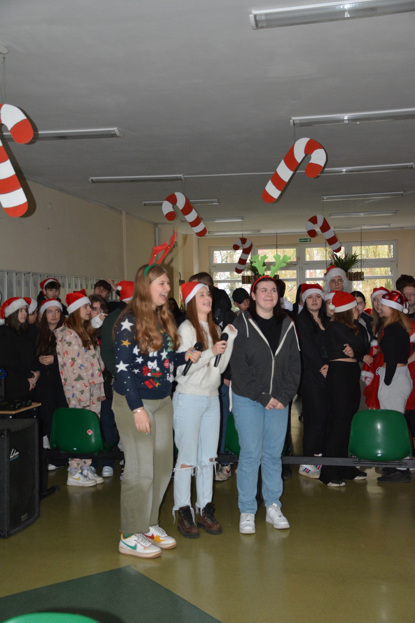 Impreza mikołajkowa - aranżacja stołów Bożonarodzeniowych, zdobienie bombek, wykonanie stroików, świąteczne karaoke, mistrzostwa szkoły na ergometrze wioślarskim, świąteczna rewia mody i zdjęcia w czapkach mikołajkowych.