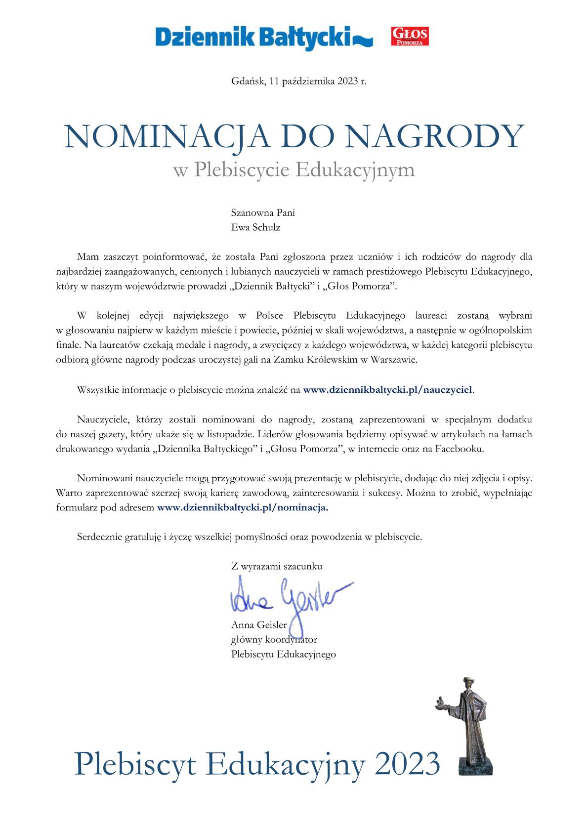Nasza szkoła została zgłoszona przez uczniów i ich rodziców do nagrody w tegorocznej edycji Plebiscytu Edukacyjnego 2023, który organizuje redakcja "Dziennika Bałtyckiego" i "Głosu Pomorza"!