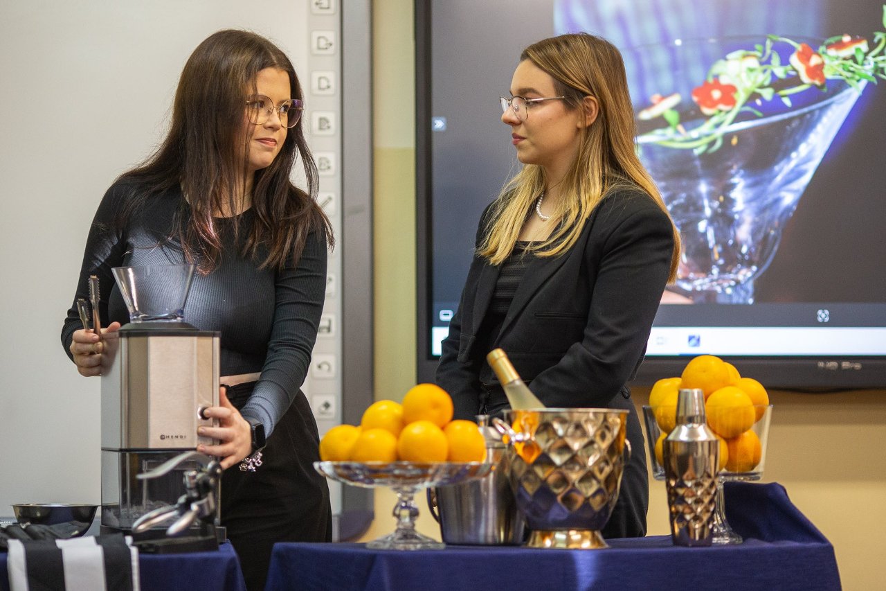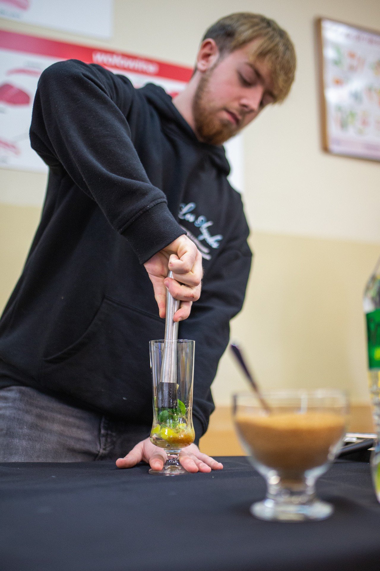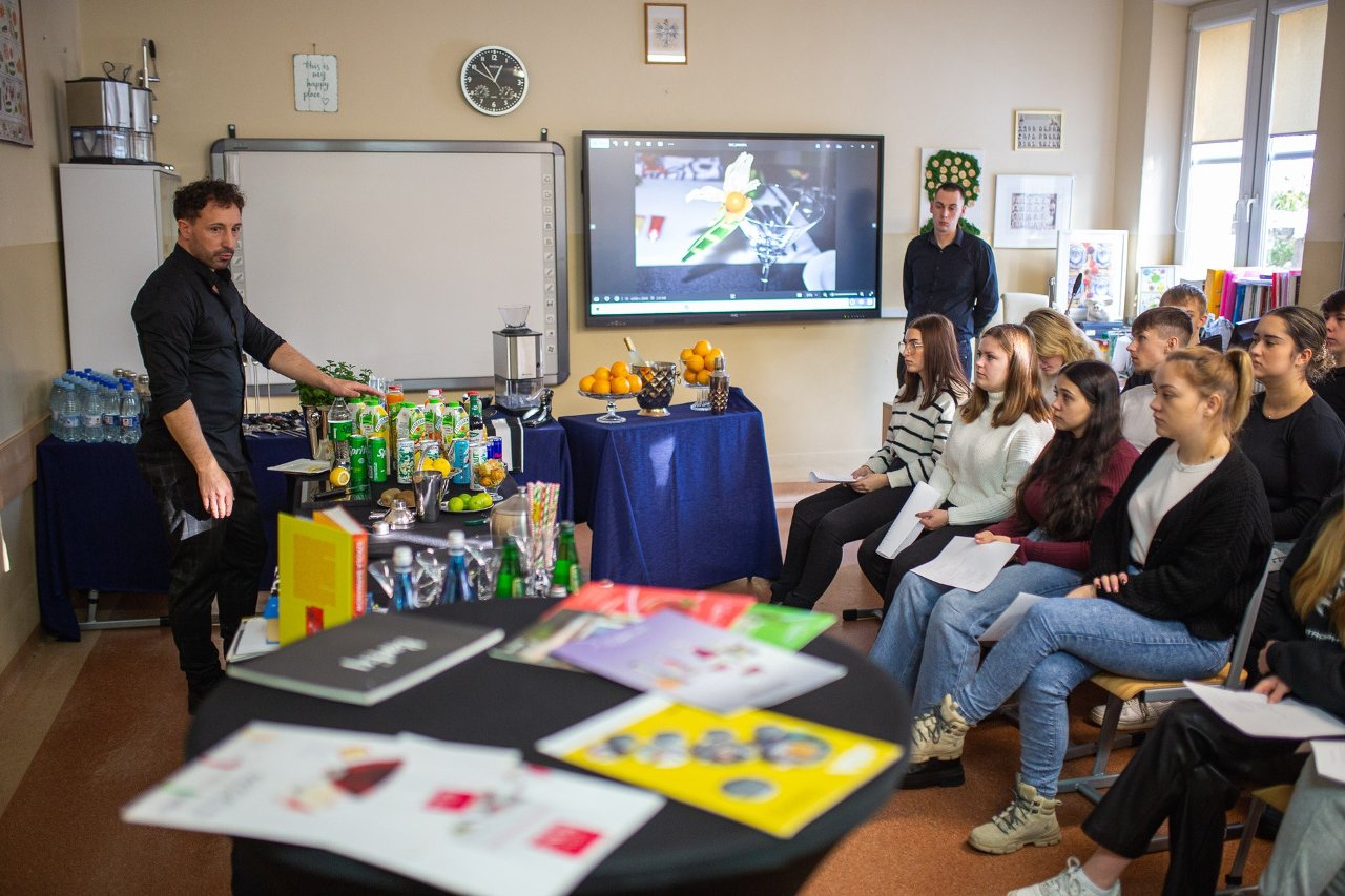 Zajęcia dla uczniów piątych klas z kierunków technik żywienia i usług gastronomicznych oraz technik technologii żywności poprowadził Daniel Poświętny - dyplomowany barman mixer drugiego stopnia, były członek Stowarzyszenia Polskich Barmanów, współzałożyciel pierwszego w Słupsku koła barmańskiego.