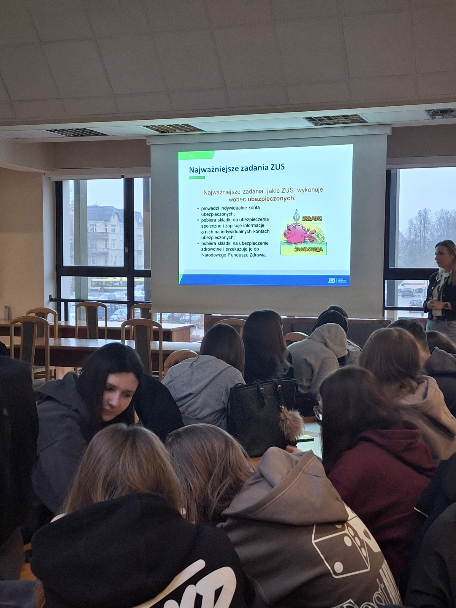 Warsztaty odbyły się 21 stycznia 2025 roku (piątek) na których uczestniczyli uczniowie klas pierwszych kierunków informatyki, architektury krajobrazu oraz żywienia i usług gastronomicznych. Uczestnicy spotkania mieli okazję poszerzyć i uzupełnić wiedzę z zakresu ubezpieczeń społecznych i na koniec pobytu uzyskać odpowiedzi na nurtujące ich pytania.